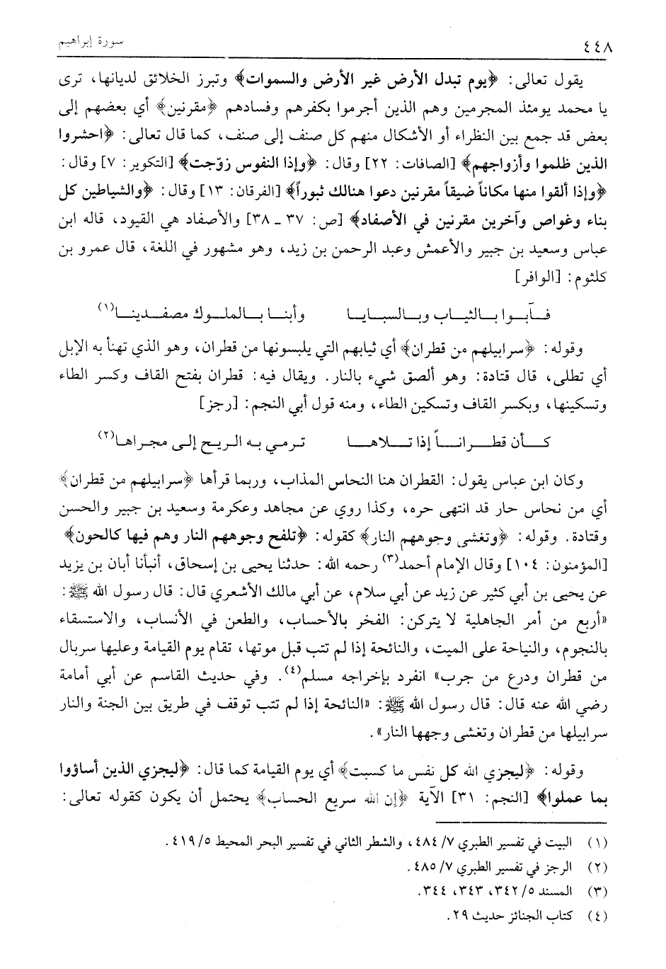 وَكَانَ ابْنُ عَبَّاسٍ يَقُولُ: الْقَطِرَانُ هنا النُّحَاسُ الْمُذَابُ، وَرُبَّمَا قَرَأَهَا سَرابِيلُهُمْ مِنْ قَطِرانٍ أَيْ مِنْ نُحَاسٍ حَارٍّ قَدِ انْتَهَى حَرُّهُ، وَكَذَا رُوِيَ عَنْ مُجَاهِدٍ وَعِكْرِمَةَ وَسَعِيدِ بْنِ جُبَيْرٍ وَالْحَسَنِ وَقَتَادَةَ. وَقَوْلُهُ: وَتَغْشى وُجُوهَهُمُ النَّارُ كَقَوْلِهِ: تَلْفَحُ وُجُوهَهُمُ النَّارُ وَهُمْ فِيها كالِحُونَ [الْمُؤْمِنُونَ: 104] وَقَالَ الْإِمَامُ أَحْمَدُ «3» رَحِمَهُ اللَّهُ: حَدَّثَنَا يَحْيَى بْنُ إِسْحَاقَ، أَنْبَأَنَا أَبَانُ بْنُ يَزِيدَ عَنْ يَحْيَى بْنِ أَبِي كَثِيرٍ عَنْ زَيْدٍ عَنْ أَبِي سَلَّامٍ، عَنْ أَبِي مَالِكٍ الْأَشْعَرِيِّ قَالَ: قَالَ رَسُولُ اللَّهِ صَلَّى اللَّهُ عَلَيْهِ وَسَلَّمَ: