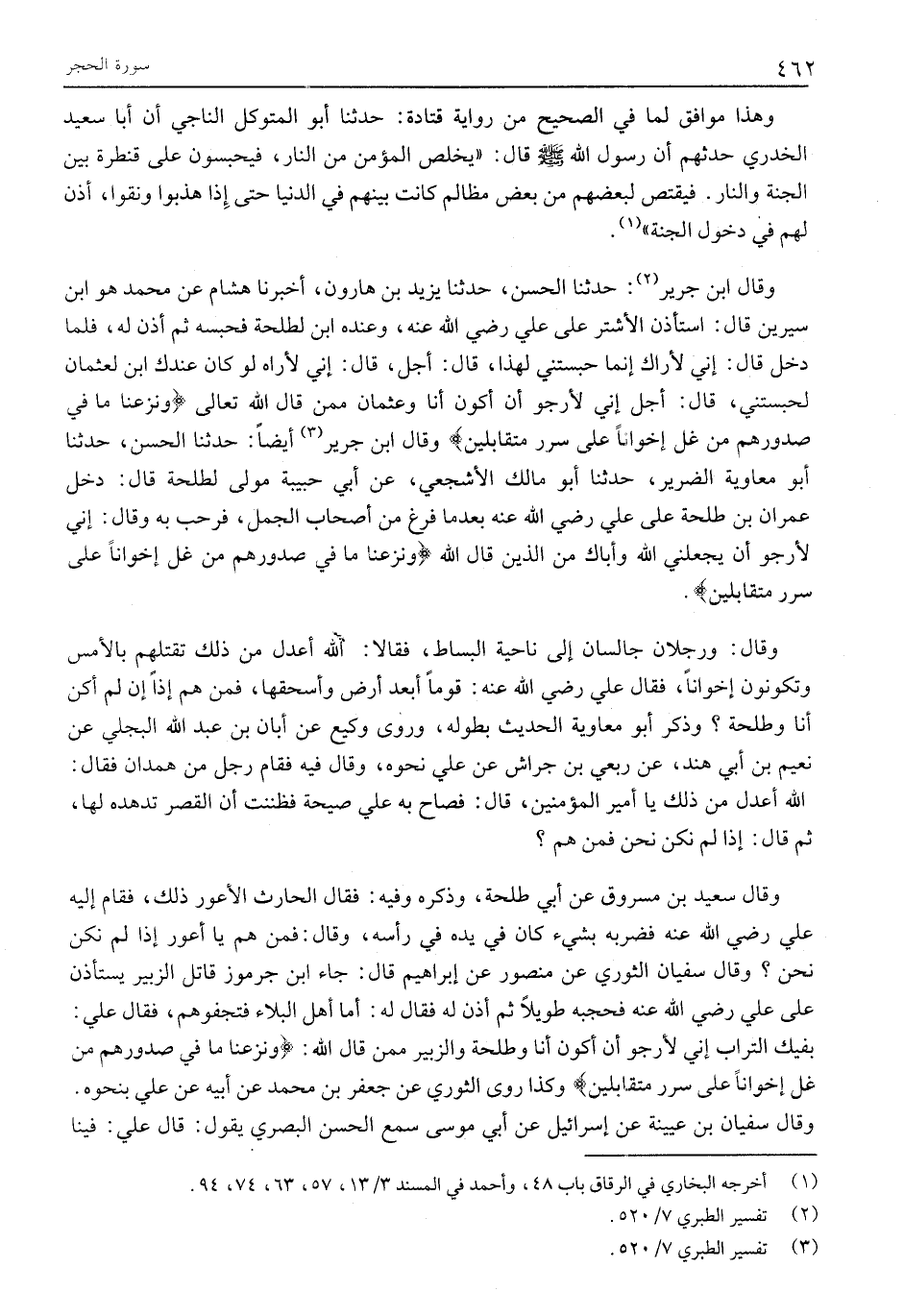 وَقَالَ ابْنُ جَرِيرٍ «2» : حَدَّثَنَا الْحَسَنُ، حَدَّثَنَا يَزِيدُ بْنُ هَارُونَ، أَخْبَرَنَا هِشَامٌ عَنْ مُحَمَّدٍ هُوَ ابْنُ سِيرِينَ قَالَ: اسْتَأْذَنَ الْأَشْتَرُ عَلَى عَلِيٍّ رَضِيَ اللَّهُ عَنْهُ، وَعِنْدَهُ ابْنٌ لِطَلْحَةَ فَحَبَسَهُ ثُمَّ أَذِنَ لَهُ، فَلَمَّا دَخَلَ قَالَ: إِنِّي لأراك إنما حبستني لِهَذَا، قَالَ: أَجَلْ، قَالَ: إِنِّي لَأَرَاهُ لَوْ كَانَ عِنْدَكَ ابْنٌ لِعُثْمَانَ لَحَبَسْتَنِي، قَالَ: أَجَلْ إِنِّي لَأَرْجُو أَنْ أَكُونَ أَنَا وَعُثْمَانُ مِمَّنْ قَالَ اللَّهُ تَعَالَى وَنَزَعْنا مَا فِي صُدُورِهِمْ مِنْ غِلٍّ إِخْواناً عَلى سُرُرٍ مُتَقابِلِينَ وَقَالَ ابن جرير «3» أيضا: حدثنا الْحَسَنُ، حَدَّثَنَا أَبُو مُعَاوِيَةَ الضَّرِيرُ، حَدَّثَنَا أَبُو مَالِكٍ الْأَشْجَعِيُّ، عَنْ أَبِي حَبِيبَةَ مَوْلًى لِطَلْحَةَ قَالَ: دَخَلَ عِمْرَانُ بْنُ طَلْحَةَ عَلَى عَلِيٍّ رضي الله عنه بعد ما فَرَغَ مِنْ أَصْحَابِ الْجَمَلِ، فَرَحَّبَ بِهِ وَقَالَ: إِنِّي لَأَرْجُو أَنْ يَجْعَلَنِي اللَّهُ وَأَبَاكَ مِنَ الَّذِينَ قَالَ اللَّهُ وَنَزَعْنا مَا فِي صُدُورِهِمْ مِنْ غِلٍّ إِخْواناً عَلى سُرُرٍ مُتَقابِلِينَ.
