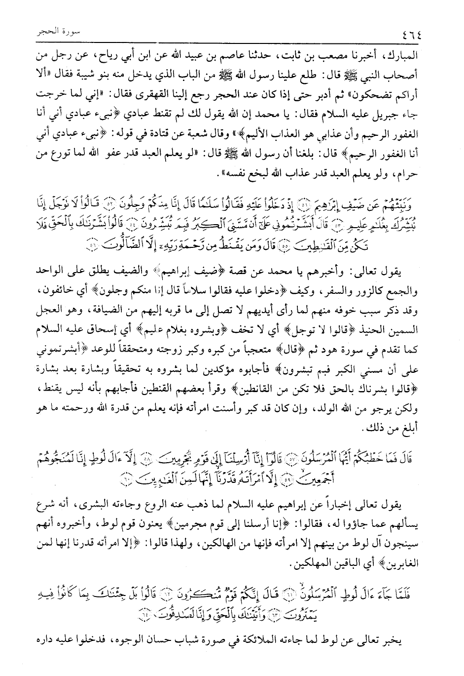 وَنَبِّئْهُمْ عَنْ ضَيْفِ إِبْراهِيمَ (51) إِذْ دَخَلُوا عَلَيْهِ فَقالُوا سَلاماً قالَ إِنَّا مِنْكُمْ وَجِلُونَ (52) قالُوا لَا تَوْجَلْ إِنَّا نُبَشِّرُكَ بِغُلامٍ عَلِيمٍ (53) قالَ أَبَشَّرْتُمُونِي عَلى أَنْ مَسَّنِيَ الْكِبَرُ فَبِمَ تُبَشِّرُونَ (54) قالُوا بَشَّرْناكَ بِالْحَقِّ فَلا تَكُنْ مِنَ الْقانِطِينَ (55)