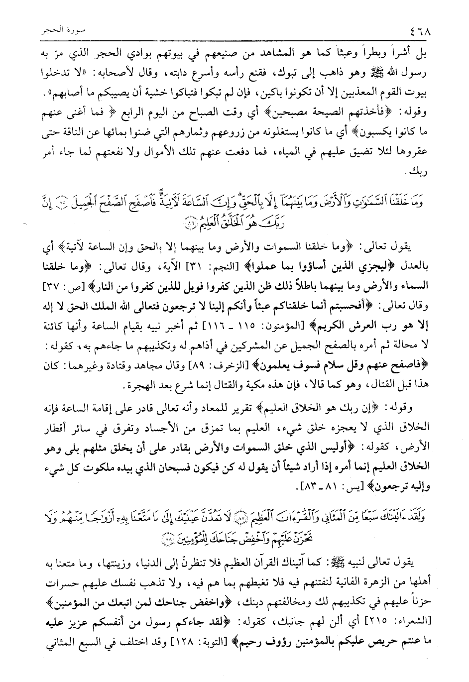 [ص: 37] وَقَالَ تَعَالَى: أَفَحَسِبْتُمْ أَنَّما خَلَقْناكُمْ عَبَثاً وَأَنَّكُمْ إِلَيْنا لَا تُرْجَعُونَ فَتَعالَى اللَّهُ الْمَلِكُ الْحَقُّ لَا إِلهَ إِلَّا هُوَ رَبُّ الْعَرْشِ الْكَرِيمِ [الْمُؤْمِنُونَ: 115- 116] ثُمَّ أَخْبَرَ نَبِيَّهُ بِقِيَامِ السَّاعَةِ وَأَنَّهَا كَائِنَةٌ لَا مَحَالَةَ ثُمَّ أَمَرَهُ بِالصَّفْحِ الْجَمِيلِ عَنِ الْمُشْرِكِينَ فِي أَذَاهُمْ لَهُ وَتَكْذِيبِهِمْ مَا جَاءَهُمْ بِهِ، كقوله: