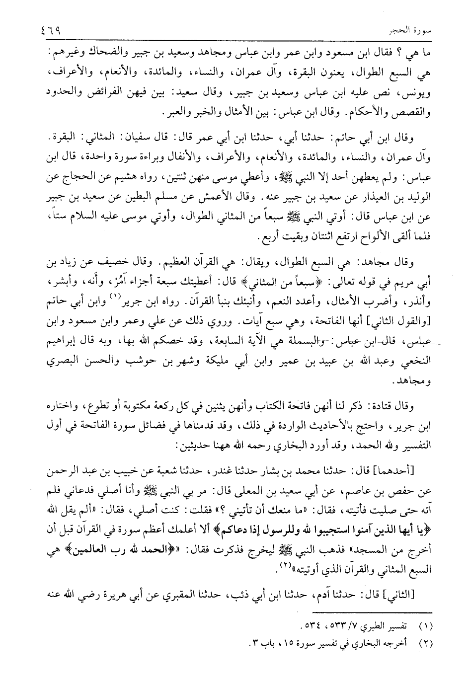 وَقَالَ قَتَادَةُ: ذُكِرَ لَنَا أَنَّهُنَّ فَاتِحَةُ الْكِتَابِ وَأَنَّهُنَّ يثنين فِي كُلِّ رَكْعَةٍ مَكْتُوبَةٍ أَوْ تَطَوُّعٍ، وَاخْتَارَهُ ابْنُ جَرِيرٍ، وَاحْتَجَّ بِالْأَحَادِيثِ الْوَارِدَةِ فِي ذَلِكَ، وَقَدْ قَدَّمْنَاهَا فِي فَضَائِلِ سُورَةِ الْفَاتِحَةِ فِي أَوَّلِ التَّفْسِيرِ وَلِلَّهِ الْحَمْدُ، وَقَدْ أَوْرَدَ الْبُخَارِيُّ رَحِمَهُ اللَّهُ هَاهُنَا حَدِيثَيْنَ: