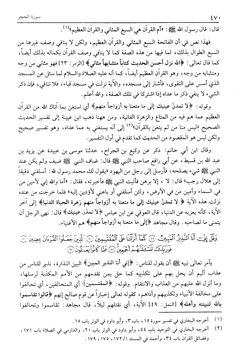فَهَذَا نَصٌّ فِي أَنَّ الْفَاتِحَةَ السَّبْعُ الْمَثَانِي وَالْقُرْآنُ الْعَظِيمُ، وَلَكِنْ لَا يُنَافِي وَصْفَ غيرها من السبع الطوال بِذَلِكَ، لِمَا فِيهَا مِنْ هَذِهِ الصِّفَةِ كَمَا لَا يُنَافِي وَصْفَ الْقُرْآنِ بِكَمَالِهِ بِذَلِكَ أَيْضًا، كَمَا قَالَ تَعَالَى: اللَّهُ نَزَّلَ أَحْسَنَ الْحَدِيثِ كِتاباً مُتَشابِهاً مَثانِيَ [الزُّمَرِ: 23] فَهُوَ مَثَانِي مِنْ وَجْهٍ وَمُتَشَابِهٌ مِنْ وَجْهٍ، وَهُوَ الْقُرْآنُ الْعَظِيمُ أيضا، كما أنه عليه الصلاة والسلام لَمَّا سُئِلَ عَنِ الْمَسْجِدِ الَّذِي أُسِّسَ عَلَى التَّقْوَى، فَأَشَارَ إِلَى مَسْجِدِهِ، وَالْآيَةُ نَزَلَتْ فِي مَسْجِدِ قُبَاءٍ، فَلَا تَنَافِيَ، فَإِنَّ ذِكْرَ الشَّيْءِ لَا يَنْفِي ذِكْرَ مَا عَدَاهُ إِذَا اشْتَرَكَا فِي تِلْكَ الصِّفَةِ، وَاللَّهُ أَعْلَمُ.