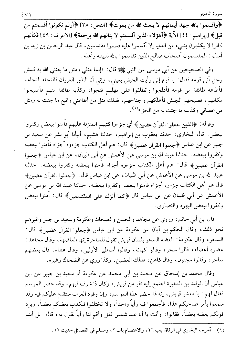 وَقَوْلُهُ: الَّذِينَ جَعَلُوا الْقُرْآنَ عِضِينَ أَيْ جَزَّءُوا كُتُبَهُمُ الْمُنَزَّلَةَ عَلَيْهِمْ فَآمَنُوا بِبَعْضٍ وَكَفَرُوا بِبَعْضٍ. قَالَ الْبُخَارِيُّ: حَدَّثَنَا يَعْقُوبُ بْنُ إِبْرَاهِيمَ، حَدَّثَنَا هُشَيْمٌ، أَنْبَأَنَا أَبُو بِشْرٍ عَنْ سَعِيدِ بْنِ جُبَيْرٍ عَنِ ابْنِ عَبَّاسٍ جَعَلُوا الْقُرْآنَ عِضِينَ قَالَ: هُمْ أَهْلُ الْكِتَابِ جَزَّءُوهُ أَجْزَاءً فَآمَنُوا بِبَعْضِهِ وَكَفَرُوا بِبَعْضِهِ. حَدَّثَنَا عُبَيْدُ اللَّهِ بْنُ مُوسَى عَنِ الْأَعْمَشِ عَنْ أَبِي ظَبْيَانَ، عَنِ ابْنِ عَبَّاسٍ جَعَلُوا الْقُرْآنَ عِضِينَ قَالَ: هُمْ أَهْلُ الْكِتَابِ جَزَّءُوهُ أَجْزَاءً فَآمَنُوا بِبَعْضِهِ وَكَفَرُوا بِبَعْضِهِ. حَدَّثَنَا عُبَيْدُ اللَّهِ بْنُ مُوسَى عَنِ الْأَعْمَشِ عَنْ أَبِي ظَبْيَانَ، عَنِ ابْنِ عَبَّاسٍ قال: جَعَلُوا الْقُرْآنَ عِضِينَ قَالَ هُمْ أَهْلُ الْكِتَابِ جَزَّءُوهُ أَجْزَاءً فَآمَنُوا بِبَعْضِهِ وَكَفَرُوا بِبَعْضِهِ، حَدَّثَنَا عُبَيْدُ اللَّهِ بْنُ مُوسَى عَنِ الْأَعْمَشِ عَنْ أَبِي ظَبْيَانَ عَنِ ابْنِ عَبَّاسٍ قال كَما أَنْزَلْنا عَلَى الْمُقْتَسِمِينَ قَالَ: آمَنُوا بِبَعْضٍ وَكَفَرُوا بِبَعْضٍ الْيَهُودُ وَالنَّصَارَى.