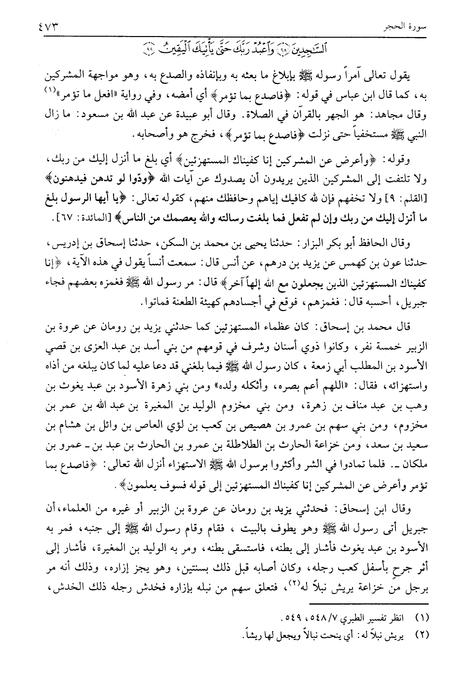 قال مُحَمَّدُ بْنُ إِسْحَاقَ: كَانَ عُظَمَاءُ الْمُسْتَهْزِئِينَ كَمَا حَدَّثَنِي يَزِيدَ بْنِ رُومَانَ عَنْ عُرْوَةَ بْنِ الزُّبَيْرِ خمسة نفر، وكانوا ذَوِي أَسْنَانٍ وَشَرَفٍ فِي قَوْمِهِمْ مِنْ بَنِي أَسَدِ بْنِ عَبْدِ الْعُزَّى بْنِ قُصَيٍّ الْأَسْوَدُ بن المطلب أبي زَمْعَةَ، كَانَ رَسُولُ اللَّهِ صَلَّى اللَّهُ عَلَيْهِ وَسَلَّمَ فِيمَا بَلَغَنِي قَدْ دَعَا عَلَيْهِ لِمَا كان يبلغه من أذاه واستهزائه، فَقَالَ: «اللَّهُمَّ أَعْمِ بَصَرَهُ، وَأَثْكِلْهُ وَلَدَهُ» وَمِنْ بَنِي زُهْرَةَ الْأَسْوَدُ بْنُ عَبْدِ يَغُوثَ بْنِ وَهْبِ بْنِ عَبْدِ مَنَافِ بْنِ زُهْرَةَ، وَمِنْ بَنِي مَخْزُومٍ الْوَلِيدَ بْنَ الْمُغِيرَةِ بْنِ عَبْدِ اللَّهِ بْنِ عُمَرَ بْنِ مَخْزُومٍ، وَمِنْ بَنِي سَهْمِ بْنِ عَمْرِو بْنِ هُصَيْصِ بْنِ كَعْبِ بْنِ لُؤَيٍّ الْعَاصُ بْنُ وَائِلِ بْنِ هِشَامِ بْنِ سَعِيدِ بْنِ سَعْدٍ، وَمِنْ خُزَاعَةَ الْحَارِثُ بْنُ الطُّلَاطِلَةِ بْنِ عَمْرِو بْنِ الْحَارِثِ بْنِ عبد بن- عَمْرِو بْنِ مَلْكَانَ-. فَلَمَّا تَمَادَوْا فِي الشَّرِّ وَأَكْثَرُوا بِرَسُولِ اللَّهِ صَلَّى اللَّهُ عَلَيْهِ وَسَلَّمَ الِاسْتِهْزَاءَ أَنْزَلَ اللَّهُ تَعَالَى: فَاصْدَعْ بِما تُؤْمَرُ وَأَعْرِضْ عَنِ الْمُشْرِكِينَ إِنَّا كَفَيْناكَ الْمُسْتَهْزِئِينَ إِلَى قَوْلِهِ فَسَوْفَ يَعْلَمُونَ.