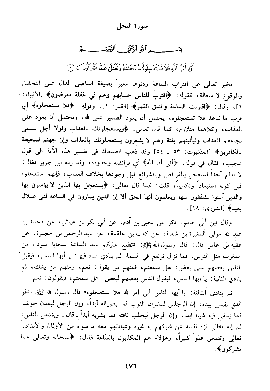 1] ، وَقَالَ: اقْتَرَبَتِ السَّاعَةُ وَانْشَقَّ الْقَمَرُ [الْقَمَرِ: 1] . وَقَوْلُهُ: فَلا تَسْتَعْجِلُوهُ أَيْ قَرُبَ مَا تَبَاعَدَ فَلَا تَسْتَعْجِلُوهُ، يُحْتَمَلُ أَنْ يَعُودَ الضَّمِيرُ عَلَى اللَّهِ، وَيُحْتَمَلُ أَنْ يَعُودَ عَلَى الْعَذَابِ، وَكِلَاهُمَا مُتَلَازِمٌ، كَمَا قَالَ تَعَالَى: وَيَسْتَعْجِلُونَكَ بِالْعَذابِ وَلَوْلا أَجَلٌ مُسَمًّى لَجاءَهُمُ الْعَذابُ وَلَيَأْتِيَنَّهُمْ بَغْتَةً وَهُمْ لَا يَشْعُرُونَ يَسْتَعْجِلُونَكَ بِالْعَذابِ وَإِنَّ جَهَنَّمَ لَمُحِيطَةٌ بِالْكافِرِينَ [الْعَنْكَبُوتِ: 53- 54] وَقَدْ ذَهَبَ الضَّحَّاكُ فِي تَفْسِيرِ هَذِهِ الْآيَةِ إِلَى قَوْلٍ عَجِيبٍ، فَقَالَ فِي قَوْلِهِ: أَتى أَمْرُ اللَّهِ أَيْ فَرَائِضُهُ وَحُدُودُهُ، وَقَدْ رَدَّهُ ابْنُ جَرِيرٍ فَقَالَ: