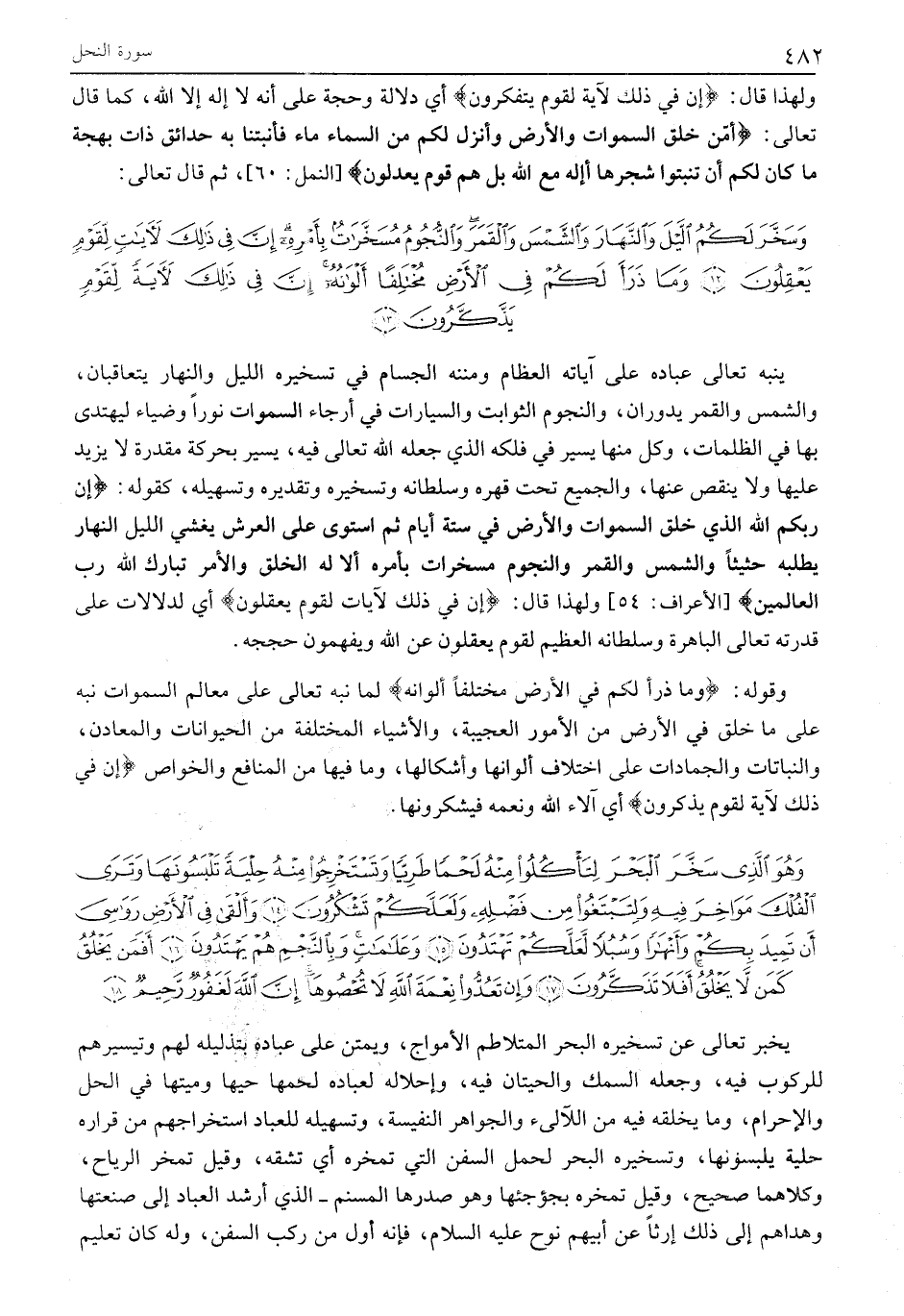 وَهُوَ الَّذِي سَخَّرَ الْبَحْرَ لِتَأْكُلُوا مِنْهُ لَحْماً طَرِيًّا وَتَسْتَخْرِجُوا مِنْهُ حِلْيَةً تَلْبَسُونَها وَتَرَى الْفُلْكَ مَواخِرَ فِيهِ وَلِتَبْتَغُوا مِنْ فَضْلِهِ وَلَعَلَّكُمْ تَشْكُرُونَ (14) وَأَلْقى فِي الْأَرْضِ رَواسِيَ أَنْ تَمِيدَ بِكُمْ وَأَنْهاراً وَسُبُلاً لَعَلَّكُمْ تَهْتَدُونَ (15) وَعَلاماتٍ وَبِالنَّجْمِ هُمْ يَهْتَدُونَ (16) أَفَمَنْ يَخْلُقُ كَمَنْ لَا يَخْلُقُ أَفَلا تَذَكَّرُونَ (17) وَإِنْ تَعُدُّوا نِعْمَةَ اللَّهِ لَا تُحْصُوها إِنَّ اللَّهَ لَغَفُورٌ رَحِيمٌ (18)