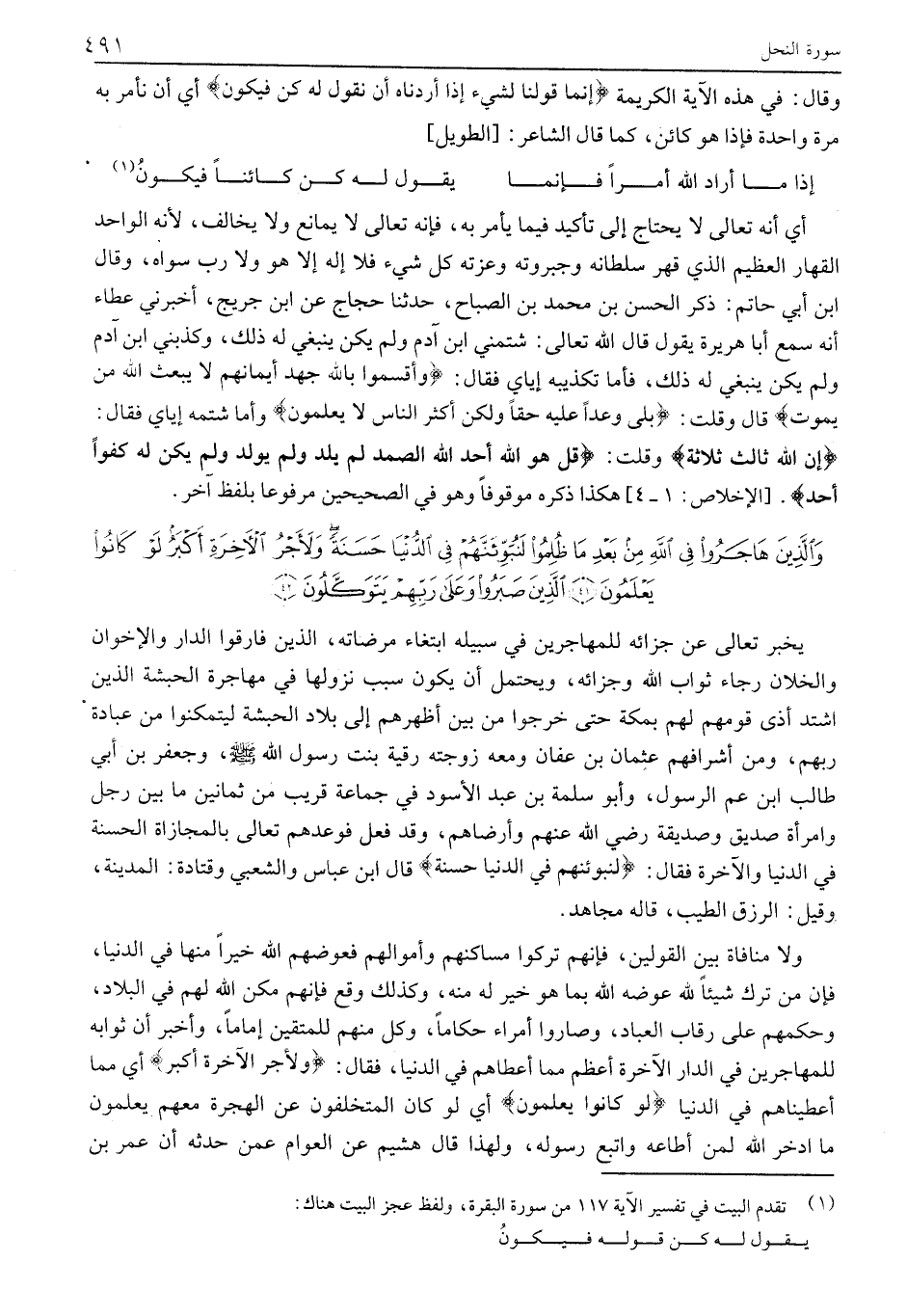 وَقَالَ: فِي هَذِهِ الْآيَةِ الْكَرِيمَةِ إِنَّما قَوْلُنا لِشَيْءٍ إِذا أَرَدْناهُ أَنْ نَقُولَ لَهُ كُنْ فَيَكُونُ أي أن نأمر به مرة وَاحِدَةً فَإِذَا هُوَ كَائِنٌ، كَمَا قَالَ الشَّاعِرُ: [الطويل]