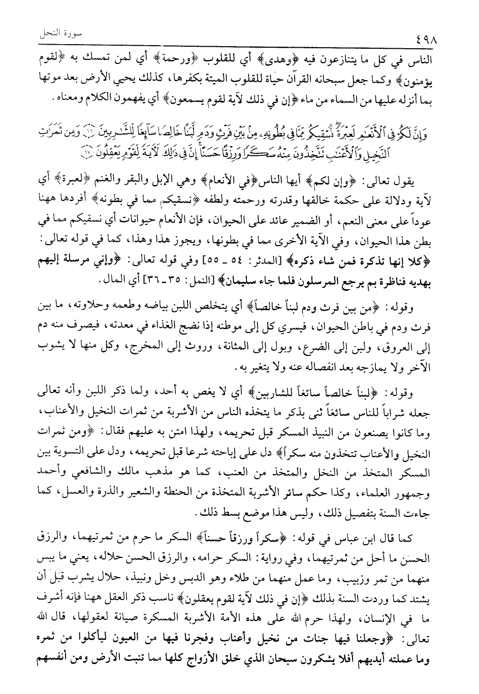 وَإِنَّ لَكُمْ فِي الْأَنْعامِ لَعِبْرَةً نُسْقِيكُمْ مِمَّا فِي بُطُونِهِ مِنْ بَيْنِ فَرْثٍ وَدَمٍ لَبَناً خالِصاً سائِغاً لِلشَّارِبِينَ (66) وَمِنْ ثَمَراتِ النَّخِيلِ وَالْأَعْنابِ تَتَّخِذُونَ مِنْهُ سَكَراً وَرِزْقاً حَسَناً إِنَّ فِي ذلِكَ لَآيَةً لِقَوْمٍ يَعْقِلُونَ (67)