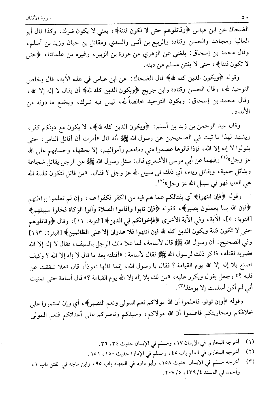 وَقَالَ عَبْدُ الرَّحْمَنِ بْنُ زَيْدِ بْنِ أَسْلَمَ: وَيَكُونَ الدِّينُ كُلُّهُ لِلَّهِ، لَا يَكُونُ مَعَ دِينِكُمْ كُفْرٌ، ويشهد لهذا مَا ثَبَتَ فِي الصَّحِيحَيْنِ عَنْ رَسُولِ اللَّهِ صَلَّى اللَّهُ عَلَيْهِ وَسَلَّمَ أَنَّهُ قَالَ «أُمِرْتُ أَنْ أُقَاتِلَ النَّاسَ، حَتَّى يَقُولُوا لَا إِلَهَ إِلَّا اللَّهُ، فَإِذَا قَالُوهَا عَصَمُوا مِنِّي دِمَاءَهُمْ وَأَمْوَالَهُمْ، إِلَّا بِحَقِّهَا، وَحِسَابُهُمْ عَلَى اللَّهِ عَزَّ وجل» «1» وفيهما عَنْ أَبِي مُوسَى الْأَشْعَرِيِّ قَالَ: سُئِلَ رَسُولُ اللَّهِ صَلَّى اللَّهُ عَلَيْهِ وَسَلَّمَ عَنِ الرَّجُلِ يُقَاتِلُ شُجَاعَةً وَيُقَاتِلُ حَمِيَّةً، وَيُقَاتِلُ رِيَاءً، أَيُّ ذَلِكَ فِي سَبِيلِ اللَّهِ عَزَّ وَجَلَّ؟ فَقَالَ: «مَنْ قَاتَلَ لِتَكُونَ كَلِمَةُ اللَّهِ هِيَ الْعُلْيَا فَهُوَ فِي سَبِيلِ اللَّهِ عَزَّ وَجَلَّ» «2» .