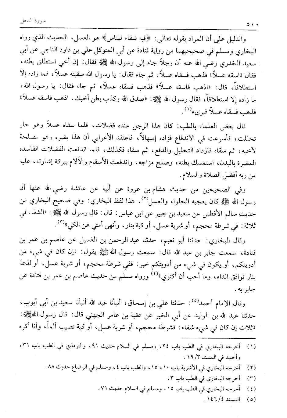 وَالدَّلِيلُ عَلَى أَنَّ الْمُرَادَ بِقَوْلِهِ تَعَالَى: فِيهِ شِفاءٌ لِلنَّاسِ هُوَ الْعَسَلُ، الْحَدِيثُ الَّذِي رَوَاهُ الْبُخَارِيُّ وَمُسْلِمٌ فِي صَحِيحَيْهِمَا مِنْ رِوَايَةِ قَتَادَةَ عَنْ أَبِي الْمُتَوَكِّلِ عَلِيِّ بْنِ دَاوُدَ النَّاجِيِّ عَنْ أَبِي سَعِيدٍ الْخُدْرِيِّ رَضِيَ اللَّهُ عَنْهُ أن رجلا جَاءَ إِلَى رَسُولِ اللَّهِ صَلَّى اللَّهُ عَلَيْهِ وَسَلَّمَ فَقَالَ: إِنَّ أَخِي اسْتَطْلَقَ بَطْنُهُ، فَقَالَ «اسقه عسلا» فذهب فَسَقَاهُ عَسَلًا، ثُمَّ جَاءَ فَقَالَ: يَا رَسُولَ اللَّهِ سَقَيْتُهُ عَسَلًا، فَمَا زَادَهُ إِلَّا اسْتِطْلَاقًا، قال: «اذهب فاسقه عسلا» فذهب فَسَقَاهُ عَسَلًا، ثُمَّ جَاءَ فَقَالَ: يَا رَسُولَ اللَّهِ، مَا زَادَهُ إِلَّا اسْتِطْلَاقًا، فَقَالَ رَسُولُ اللَّهِ صَلَّى اللَّهُ عَلَيْهِ وَسَلَّمَ: «صَدَقَ اللَّهُ وَكَذَبَ بَطْنُ أَخِيكَ، اذْهَبْ فَاسْقِهِ عَسَلًا» فَذَهَبَ فسقاه عسلا فَبَرِئَ «1» .