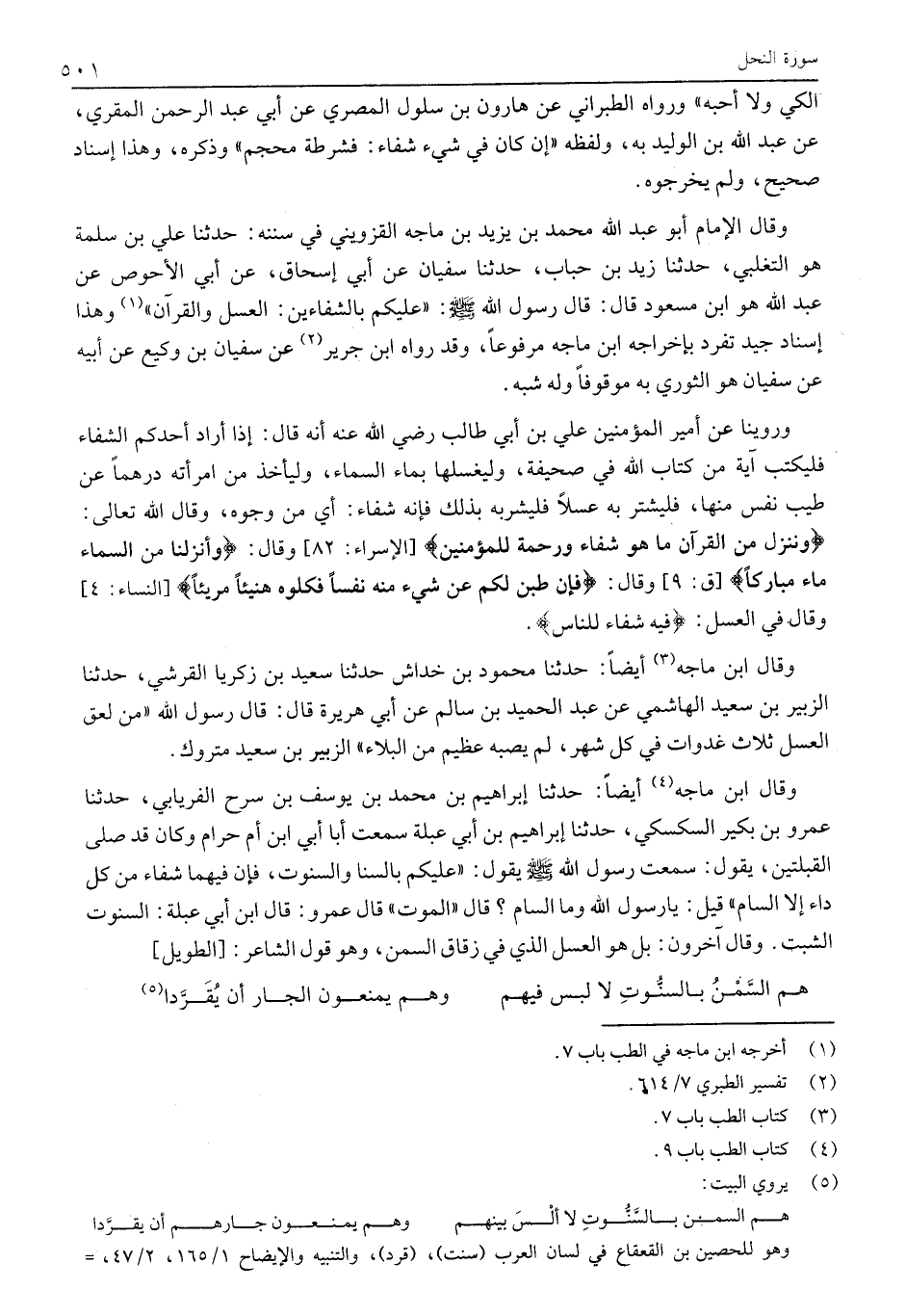 وَقَالَ الْإِمَامُ أَبُو عَبْدِ اللَّهِ مُحَمَّدُ بْنُ يَزِيدَ بْنِ مَاجَهْ الْقَزْوِينِيُّ فِي سُنَنِهِ: حَدَّثَنَا عَلِيُّ بن سلمة هو التغلبي، حدثنا زيد بن حباب، حَدَّثَنَا سُفْيَانُ عَنْ أَبِي إِسْحَاقَ، عَنْ أَبِي الْأَحْوَصِ عَنْ عَبْدِ اللَّهِ هُوَ ابْنُ مَسْعُودٍ قَالَ: قَالَ رَسُولُ اللَّهِ صَلَّى اللَّهُ عَلَيْهِ وَسَلَّمَ: «عَلَيْكُمْ بِالشِّفَاءَيْنِ: الْعَسَلُ وَالْقُرْآنُ» «1» وَهَذَا إِسْنَادٌ جَيِّدٌ تَفَرَّدَ بِإِخْرَاجِهِ ابْنُ مَاجَهْ مَرْفُوعًا، وَقَدْ رَوَاهُ ابْنُ جَرِيرٍ «2» عَنْ سُفْيَانَ بْنِ وَكِيعٍ عَنْ أَبِيهِ عَنْ سُفْيَانَ هُوَ الثَّوْرِيُّ بِهِ موقوفا وله شبه.