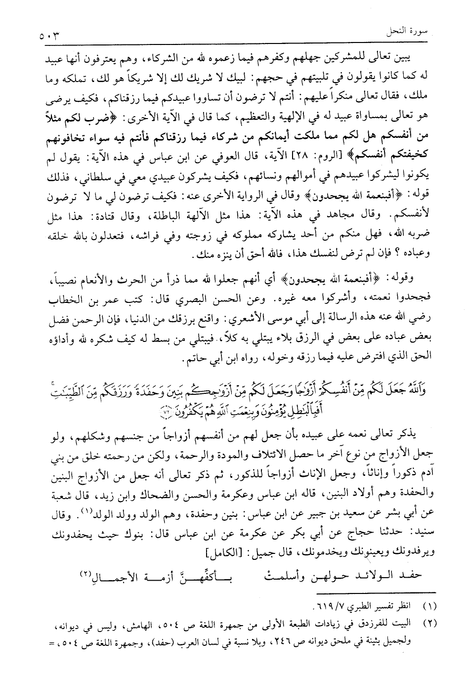 يَذْكُرُ تَعَالَى نِعَمَهُ عَلَى عَبِيدِهِ بِأَنْ جَعَلَ لَهُمْ مِنْ أَنْفُسِهِمْ أَزْوَاجًا من جنسهم وشكلهم، ولو جعل الأزواج من نوع آخر ما حصل الائتلاف والمودة والرحمة، وَلَكِنْ مِنْ رَحْمَتِهِ خَلَقَ مِنْ بَنِي آدَمَ ذُكُورًا وَإِنَاثًا، وَجَعَلَ الْإِنَاثَ أَزْوَاجًا لِلذُّكُورِ، ثُمَّ ذَكَرَ تَعَالَى أَنَّهُ جَعَلَ مِنَ الْأَزْوَاجِ الْبَنِينَ وَالْحَفَدَةَ وَهُمْ أَوْلَادُ الْبَنِينَ، قَالَهُ ابْنُ عَبَّاسٍ وَعِكْرِمَةُ وَالْحَسَنُ وَالضَّحَّاكُ وَابْنُ زَيْدٍ، قَالَ شُعْبَةَ عَنْ أَبِي بِشْرٍ عَنْ سَعِيدِ بْنِ جبير عن ابن عباس: بنين وحفدة، وهم الْوَلَدُ وَوَلَدُ الْوَلَدِ «1» . وَقَالَ سُنَيْدٌ: حَدَّثَنَا حَجَّاجٌ عَنْ أَبِي بَكْرٍ عَنْ عِكْرِمَةَ عَنِ ابْنِ عباس قال: بنوك حيث يحفدونك ويرفدونك ويعينونك ويخدمونك، قال جميل: [الكامل]