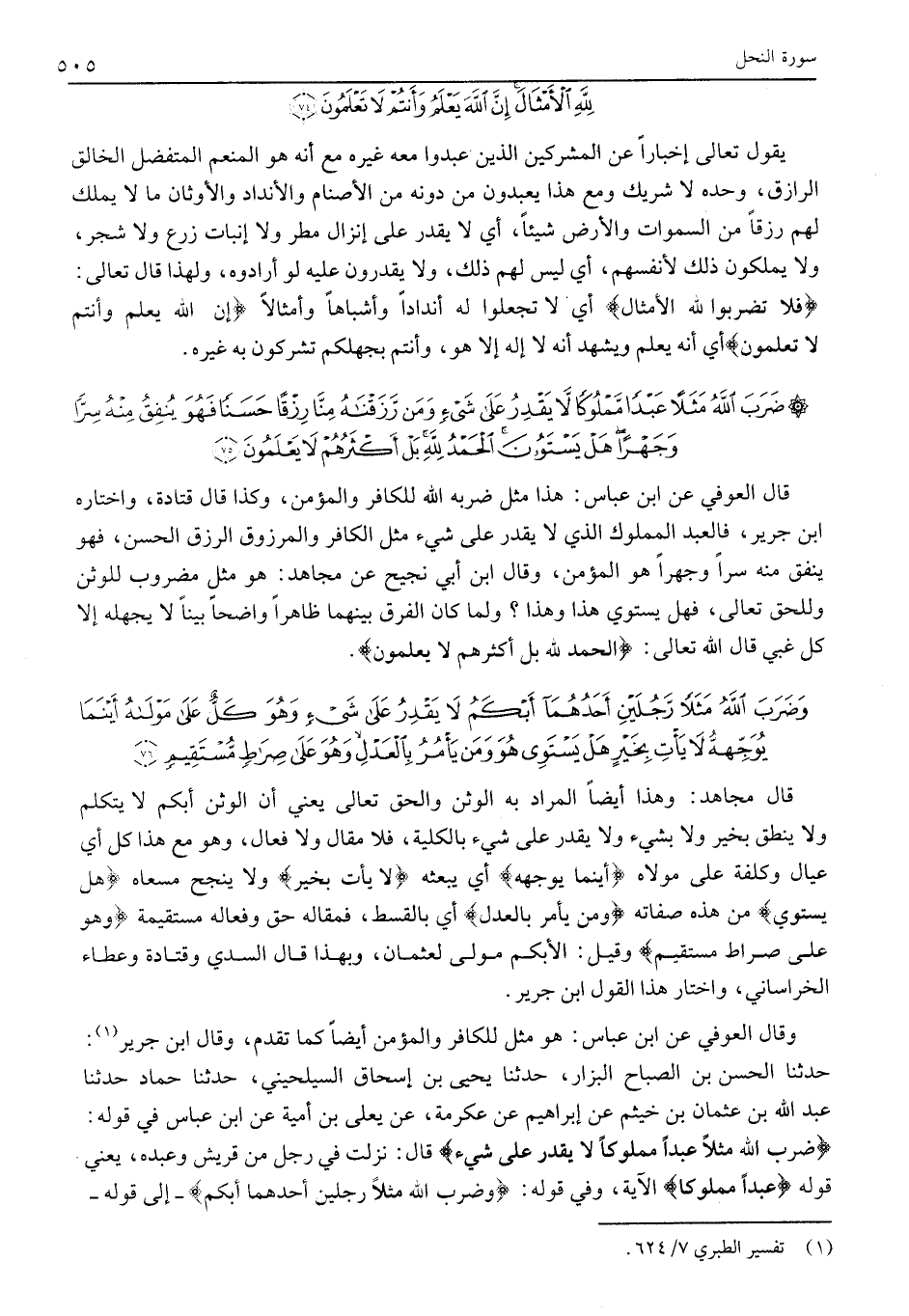 ضَرَبَ اللَّهُ مَثَلاً عَبْداً مَمْلُوكاً لَا يَقْدِرُ عَلى شَيْءٍ وَمَنْ رَزَقْناهُ مِنَّا رِزْقاً حَسَناً فَهُوَ يُنْفِقُ مِنْهُ سِرًّا وَجَهْراً هَلْ يَسْتَوُونَ الْحَمْدُ لِلَّهِ بَلْ أَكْثَرُهُمْ لَا يَعْلَمُونَ (75)