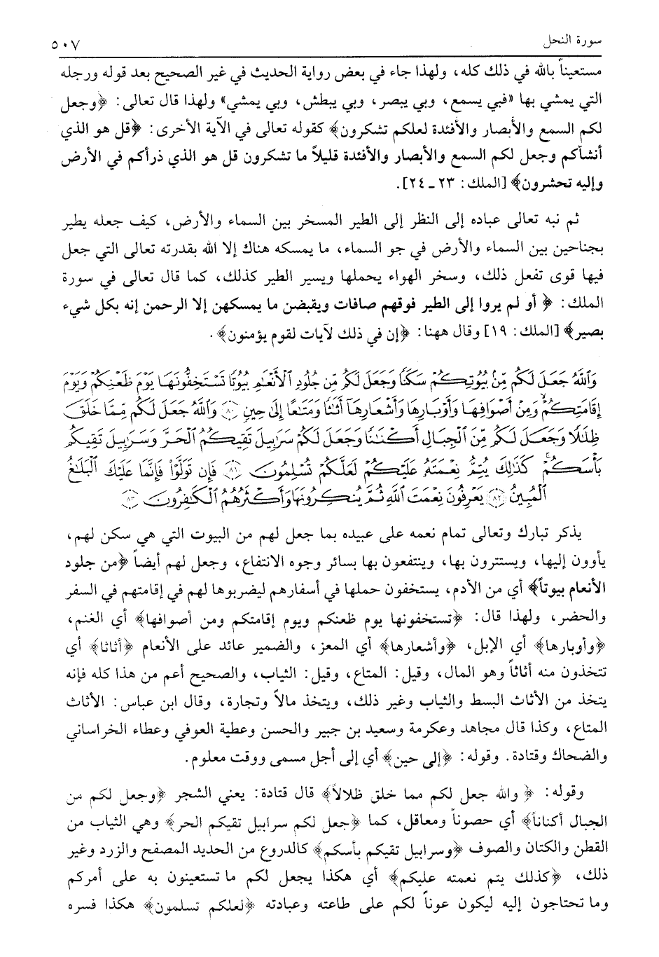 يَذْكُرُ تَبَارَكَ وَتَعَالَى تَمَامَ نِعَمِهِ عَلَى عَبِيدِهِ بِمَا جَعَلَ لَهُمْ مِنَ الْبُيُوتِ الَّتِي هِيَ سَكَنٌ لَهُمْ، يأوون إليها، ويستترون بها، وينتفعون بها بسائر وُجُوهِ الِانْتِفَاعِ، وَجَعَلَ لَهُمْ أَيْضًا مِنْ جُلُودِ الْأَنْعامِ بُيُوتاً أَيْ مِنَ الْأَدَمِ، يَسْتَخِفُّونَ حَمْلَهَا فِي أَسْفَارِهِمْ لِيَضْرِبُوهَا لَهُمْ فِي إِقَامَتِهِمْ فِي السَّفَرِ وَالْحَضَرِ، وَلِهَذَا قَالَ: تَسْتَخِفُّونَها يَوْمَ ظَعْنِكُمْ وَيَوْمَ إِقامَتِكُمْ وَمِنْ أَصْوافِها أَيِ الْغَنَمِ، وَأَوْبارِها أَيِ الْإِبِلِ، وَأَشْعارِها أَيِ الْمَعْزِ، وَالضَّمِيرُ عَائِدٌ عَلَى الْأَنْعَامِ أَثاثاً أَيْ تَتَّخِذُونَ مِنْهُ أَثَاثًا وَهُوَ الْمَالُ، وَقِيلَ: الْمَتَاعُ، وَقِيلَ: الثِّيَابُ، وَالصَّحِيحُ أَعَمُّ مِنْ هَذَا كُلِّهِ فَإِنَّهُ يُتَّخَذُ مِنَ الْأَثَاثِ الْبُسُطُ وَالثِّيَابُ وَغَيْرُ ذَلِكَ، وَيُتَّخَذُ مَالًا وَتِجَارَةً، وَقَالَ ابْنُ عَبَّاسٍ: الْأَثَاثُ الْمَتَاعُ، وَكَذَا قَالَ مُجَاهِدٌ وَعِكْرِمَةُ وَسَعِيدُ بْنُ جُبَيْرٍ وَالْحَسَنُ وَعَطِيَّةُ الْعَوْفِيُّ وَعَطَاءٌ الْخُرَاسَانِيُّ وَالضَّحَّاكُ وَقَتَادَةُ. وَقَوْلُهُ: إِلى حِينٍ أَيْ إِلَى أَجَلٍ مُسَمَّى وَوَقْتٍ مَعْلُومٍ.