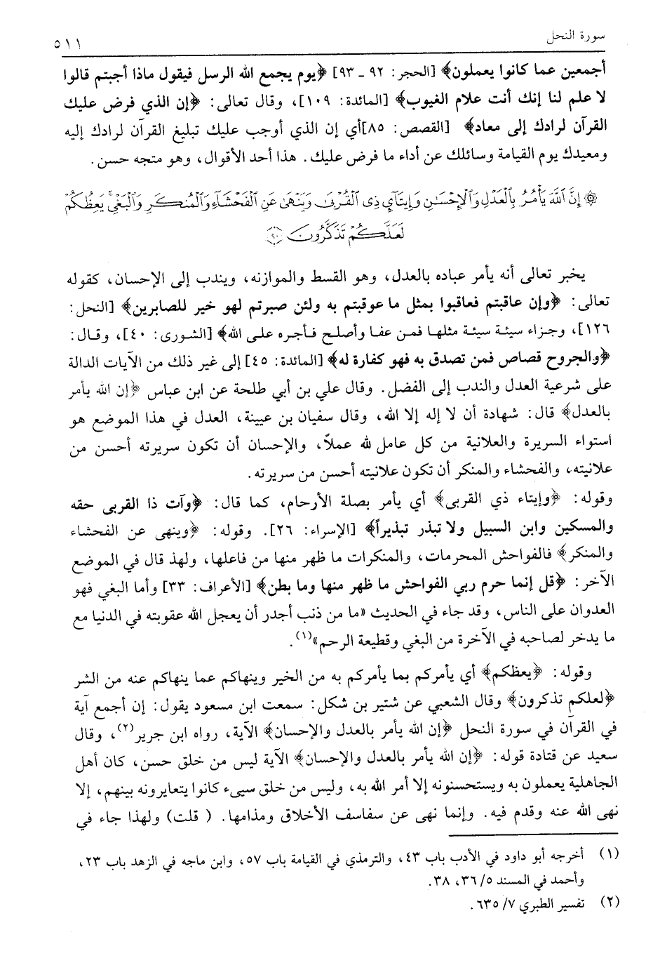 وَالْجُرُوحَ قِصاصٌ فَمَنْ تَصَدَّقَ بِهِ فَهُوَ كَفَّارَةٌ لَهُ [الْمَائِدَةِ: 45] إِلَى غَيْرِ ذَلِكَ مِنَ الْآيَاتِ الدَّالَّةِ عَلَى شَرْعِيَّةِ الْعَدْلِ وَالنَّدْبِ إِلَى الْفَضْلِ. وَقَالَ عَلِيُّ بْنُ أَبِي طَلْحَةَ عَنِ ابْنِ عَبَّاسٍ إِنَّ اللَّهَ يَأْمُرُ بِالْعَدْلِ قَالَ: شَهَادَةُ أَنْ لَا إِلَهَ إِلَّا اللَّهُ، وَقَالَ سُفْيَانُ بْنُ عُيَيْنَةَ، الْعَدْلُ فِي هَذَا الْمَوْضِعِ هُوَ اسْتِوَاءُ السَّرِيرَةِ وَالْعَلَانِيَةِ مِنْ كُلِّ عَامِلٍ لِلَّهِ عَمَلًا، وَالْإِحْسَانُ أَنْ تَكُونَ سَرِيرَتُهُ أَحْسَنَ مِنْ عَلَانِيَتِهِ، وَالْفَحْشَاءُ وَالْمُنْكِرُ أَنْ تَكُونَ عَلَانِيَتُهُ أَحْسَنَ مِنْ سَرِيرَتِهِ.
