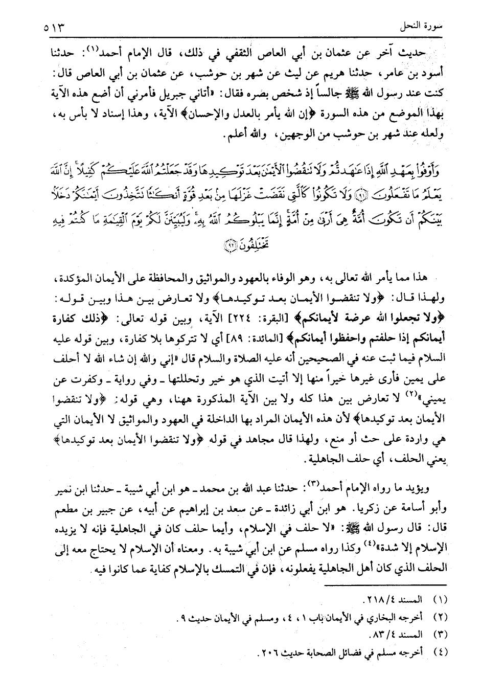 وَأَوْفُوا بِعَهْدِ اللَّهِ إِذا عاهَدْتُمْ وَلا تَنْقُضُوا الْأَيْمانَ بَعْدَ تَوْكِيدِها وَقَدْ جَعَلْتُمُ اللَّهَ عَلَيْكُمْ كَفِيلاً إِنَّ اللَّهَ يَعْلَمُ مَا تَفْعَلُونَ (91) وَلا تَكُونُوا كَالَّتِي نَقَضَتْ غَزْلَها مِنْ بَعْدِ قُوَّةٍ أَنْكاثاً تَتَّخِذُونَ أَيْمانَكُمْ دَخَلاً بَيْنَكُمْ أَنْ تَكُونَ أُمَّةٌ هِيَ أَرْبى مِنْ أُمَّةٍ إِنَّما يَبْلُوكُمُ اللَّهُ بِهِ وَلَيُبَيِّنَنَّ لَكُمْ يَوْمَ الْقِيامَةِ مَا كُنْتُمْ فِيهِ تَخْتَلِفُونَ (92)