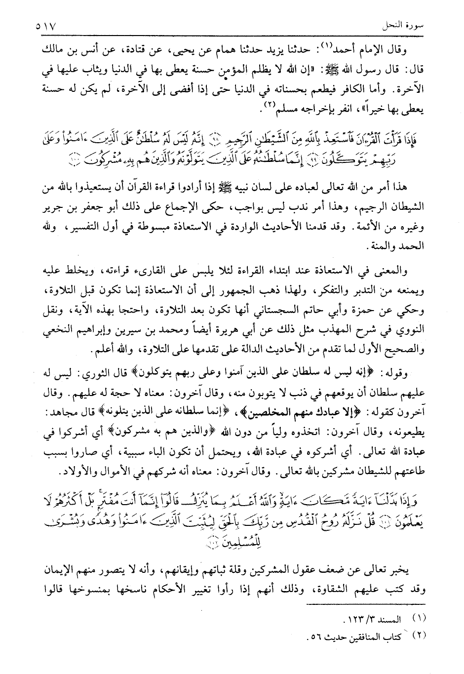 فَإِذا قَرَأْتَ الْقُرْآنَ فَاسْتَعِذْ بِاللَّهِ مِنَ الشَّيْطانِ الرَّجِيمِ (98) إِنَّهُ لَيْسَ لَهُ سُلْطانٌ عَلَى الَّذِينَ آمَنُوا وَعَلى رَبِّهِمْ يَتَوَكَّلُونَ (99) إِنَّما سُلْطانُهُ عَلَى الَّذِينَ يَتَوَلَّوْنَهُ وَالَّذِينَ هُمْ بِهِ مُشْرِكُونَ (100)