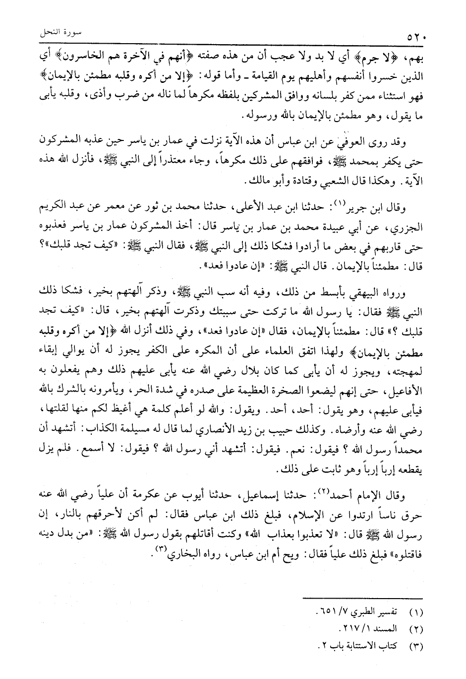 وَرَوَاهُ الْبَيْهَقِيُّ بِأَبْسَطَ مِنْ ذَلِكَ، وَفِيهِ أَنَّهُ سَبَّ النَّبِيَّ صَلَّى اللَّهُ عَلَيْهِ وَسَلَّمَ، وَذَكَرَ آلِهَتَهُمْ بِخَيْرٍ، فشكا ذَلِكَ النَّبِيَّ صَلَّى اللَّهُ عَلَيْهِ وَسَلَّمَ فَقَالَ: يا رَسُولَ اللَّهِ مَا تُرِكْتُ حَتَّى سَبَبْتُكَ وَذَكَرْتُ آلِهَتَهُمْ بِخَيْرٍ، قَالَ: «كَيْفَ تَجِدُ قَلْبَكَ؟» قَالَ: مُطَمْئِنًا بِالْإِيمَانِ، فَقَالَ «إِنْ عَادُوا فَعُدْ» ، وَفِي ذَلِكَ أَنْزَلَ اللَّهُ إِلَّا مَنْ أُكْرِهَ وَقَلْبُهُ مُطْمَئِنٌّ بِالْإِيمانِ ولهذا اتفق العلماء على أن المكره على الكفر يجوز له أن يوالي إبقاء لمهجته، ويجوز له أن يأبى كَمَا كَانَ بِلَالٌ رَضِيَ اللَّهُ عَنْهُ يَأْبَى عَلَيْهِمْ ذَلِكَ وَهُمْ يَفْعَلُونَ بِهِ الْأَفَاعِيلَ، حَتَّى إنهم ليضعوا الصَّخْرَةَ الْعَظِيمَةَ عَلَى صَدْرِهِ فِي شِدَّةِ الْحَرِّ، ويأمرونه بالشرك بِاللَّهِ فَيَأْبَى عَلَيْهِمْ، وَهُوَ يَقُولُ: أَحَدٌ، أَحَدٌ. وَيَقُولُ: وَاللَّهِ لَوْ أَعْلَمُ كَلِمَةً هِيَ أَغْيَظُ لَكُمْ مِنْهَا لَقُلْتُهَا، رَضِيَ اللَّهُ عَنْهُ وَأَرْضَاهُ. وَكَذَلِكَ حَبِيبُ بْنُ زَيْدٍ الْأَنْصَارِيُّ لَمَّا قَالَ لَهُ مُسَيْلِمَةُ الْكَذَّابُ: أَتَشْهَدُ أَنَّ مُحَمَّدًا رَسُولُ اللَّهِ؟ فَيَقُولُ: نَعَمْ. فَيَقُولُ: أَتَشْهَدُ أَنِّي رَسُولُ اللَّهِ؟ فَيَقُولُ: لَا أَسْمَعُ. فَلَمْ يَزَلْ يُقَطِّعُهُ إِرْبًا إِرْبًا وَهُوَ ثَابِتٌ عَلَى ذَلِكَ.