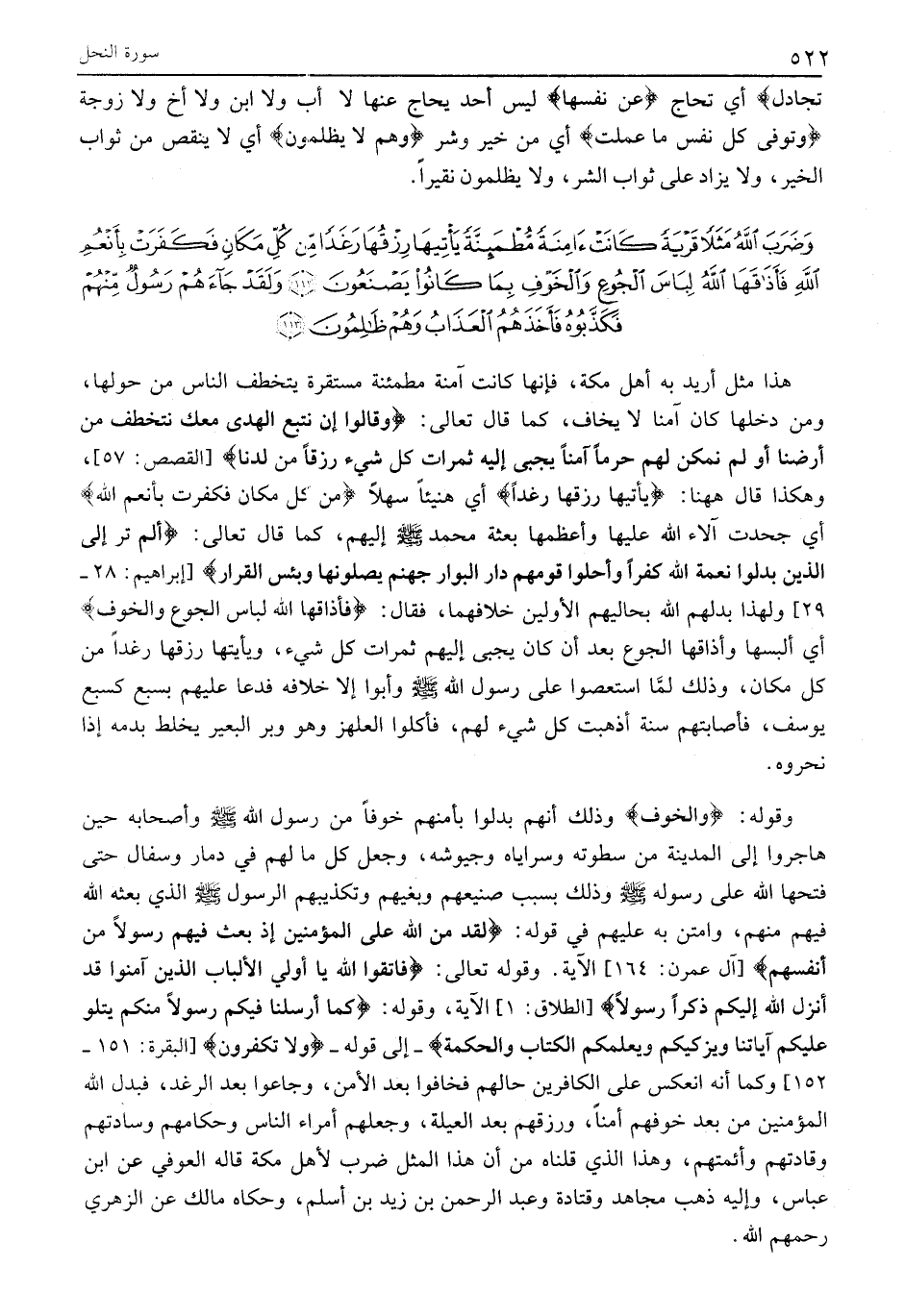 هَذَا مَثَلٌ أُرِيدَ بِهِ أَهْلُ مَكَّةَ، فَإِنَّهَا كَانَتْ آمِنَةً مُطَمْئِنَةً مُسْتَقِرَّةً يُتَخَطَّفُ النَّاسُ مِنْ حَوْلِهَا، وَمَنْ دخلها كان آمنا لَا يَخَافُ، كَمَا قَالَ تَعَالَى: وَقالُوا إِنْ نَتَّبِعِ الْهُدى مَعَكَ نُتَخَطَّفْ مِنْ أَرْضِنا أَوَلَمْ نُمَكِّنْ لَهُمْ حَرَماً آمِناً يُجْبى إِلَيْهِ ثَمَراتُ كُلِّ شَيْءٍ رِزْقاً مِنْ لَدُنَّا [الْقَصَصِ: 57] ، وَهَكَذَا قَالَ هَاهُنَا: يَأْتِيها رِزْقُها رَغَداً أَيْ هَنِيئًا سَهْلًا مِنْ كُلِّ مَكانٍ فَكَفَرَتْ بِأَنْعُمِ اللَّهِ أي جحدت آلاء الله عليها وأعظمها بِعْثَةُ مُحَمَّدٍ صَلَّى اللَّهُ عَلَيْهِ وَسَلَّمَ إِلَيْهِمْ، كَمَا قَالَ تَعَالَى: أَلَمْ تَرَ إِلَى الَّذِينَ بَدَّلُوا نِعْمَتَ اللَّهِ كُفْراً وَأَحَلُّوا قَوْمَهُمْ دارَ الْبَوارِ جَهَنَّمَ يَصْلَوْنَها وَبِئْسَ الْقَرارُ [إِبْرَاهِيمَ: 28- 29] وَلِهَذَا بَدَّلَهُمُ اللَّهُ بِحَالَيْهِمُ الْأَوَّلَيْنِ خِلَافَهُمَا، فَقَالَ: فَأَذاقَهَا اللَّهُ لِباسَ الْجُوعِ وَالْخَوْفِ أَيْ أَلْبَسَهَا وَأَذَاقَهَا الْجُوعَ بَعْدَ أَنْ كَانَ يُجْبَى إِلَيْهِمْ ثَمَرَاتُ كُلِّ شَيْءٍ، وَيَأْتِيهَا رِزْقُهَا رَغَدًا مِنْ كُلِّ مَكَانٍ، وَذَلِكَ لَمَّا اسْتَعْصَوْا عَلَى رَسُولِ اللَّهِ صَلَّى اللَّهُ عَلَيْهِ وَسَلَّمَ وَأَبَوْا إِلَّا خِلَافَهُ فَدَعَا عَلَيْهِمْ بِسَبْعٍ كَسَبْعِ يُوسُفَ، فَأَصَابَتْهُمْ سَنَةٌ أَذْهَبَتْ كُلَّ شَيْءٍ لَهُمْ، فَأَكَلُوا الْعِلْهِزَ وَهُوَ وَبَرُ الْبَعِيرِ يخلط بدمه إذا نحروه.
