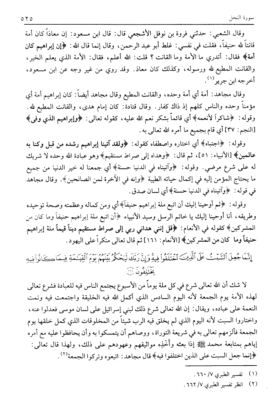 وَقَالَ مُجَاهِدٌ: أُمَّةً أَيْ أُمَّةً وَحْدَهُ، وَالْقَانِتُ الْمُطِيعُ وَقَالَ مُجَاهِدٌ أَيْضًا: كَانَ إِبْرَاهِيمُ أُمَّةً أَيْ مُؤْمِنًا وَحْدَهُ وَالنَّاسُ كُلُّهُمْ إِذْ ذَاكَ كُفَّارٌ. وَقَالَ قَتَادَةُ: كَانَ إِمَامَ هُدًى، وَالْقَانِتُ الْمُطِيعُ لِلَّهِ.