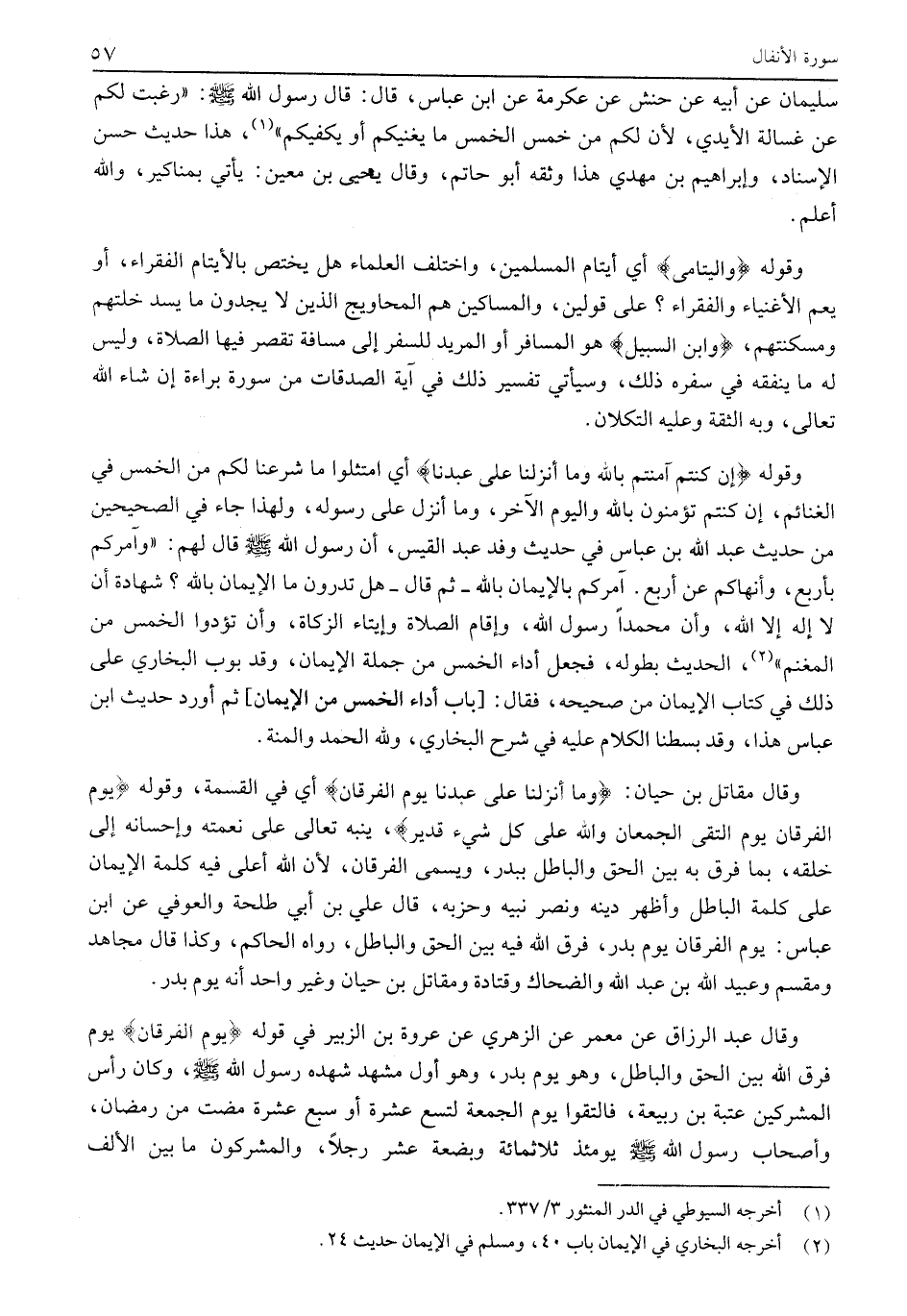 وَقَالَ مُقَاتِلُ بْنُ حَيَّانَ: وَما أَنْزَلْنا عَلى عَبْدِنا يَوْمَ الْفُرْقانِ أَيْ في القسمة، وقوله يَوْمَ الْفُرْقانِ يَوْمَ الْتَقَى الْجَمْعانِ وَاللَّهُ عَلى كُلِّ شَيْءٍ قَدِيرٌ، يُنَبِّهُ تَعَالَى عَلَى نِعْمَتِهِ وَإِحْسَانِهِ إِلَى خَلْقِهِ، بِمَا فَرَقَ بِهِ بَيْنَ الْحَقِّ وَالْبَاطِلِ بِبَدْرٍ، وَيُسَمَّى الْفُرْقَانَ، لِأَنَّ اللَّهَ أَعْلَى فِيهِ كَلِمَةَ الْإِيمَانِ عَلَى كَلِمَةِ الْبَاطِلِ وَأَظْهَرَ دِينَهُ وَنَصَرَ نَبِيَّهُ وَحِزْبَهُ، قَالَ عَلِيُّ بْنُ أَبِي طَلْحَةَ وَالْعَوْفِيُّ عَنِ ابْنِ عباس: يَوْمَ الْفُرْقَانِ يَوْمُ بَدْرٍ، فَرَقَ اللَّهُ فِيهِ بَيْنَ الْحَقِّ وَالْبَاطِلِ، رَوَاهُ الْحَاكِمُ، وَكَذَا قَالَ مُجَاهِدٌ ومِقْسَمٌ وَعُبَيْدُ اللَّهِ بْنُ عَبْدِ اللَّهِ وَالضَّحَّاكُ وقَتَادَةُ وَمُقَاتِلُ بْنُ حَيَّانَ وَغَيْرُ وَاحِدٍ أَنَّهُ يَوْمُ بَدْرٍ.