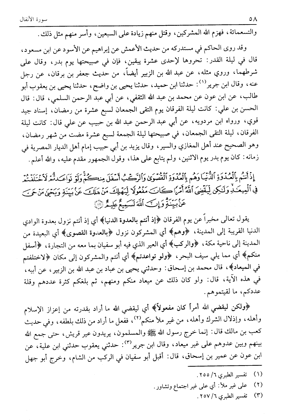 إِذْ أَنْتُمْ بِالْعُدْوَةِ الدُّنْيا وَهُمْ بِالْعُدْوَةِ الْقُصْوى وَالرَّكْبُ أَسْفَلَ مِنْكُمْ وَلَوْ تَواعَدْتُمْ لاخْتَلَفْتُمْ فِي الْمِيعادِ وَلكِنْ لِيَقْضِيَ اللَّهُ أَمْراً كانَ مَفْعُولاً لِيَهْلِكَ مَنْ هَلَكَ عَنْ بَيِّنَةٍ وَيَحْيى مَنْ حَيَّ عَنْ بَيِّنَةٍ وَإِنَّ اللَّهَ لَسَمِيعٌ عَلِيمٌ (42)
