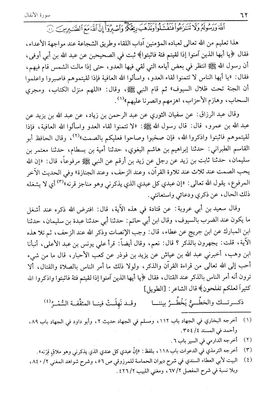 يَا أَيُّهَا الَّذِينَ آمَنُوا إِذا لَقِيتُمْ فِئَةً فَاثْبُتُوا وَاذْكُرُوا اللَّهَ كَثِيراً لَعَلَّكُمْ تُفْلِحُونَ (45) وَأَطِيعُوا اللَّهَ وَرَسُولَهُ وَلا تَنازَعُوا فَتَفْشَلُوا وَتَذْهَبَ رِيحُكُمْ وَاصْبِرُوا إِنَّ اللَّهَ مَعَ الصَّابِرِينَ (46)