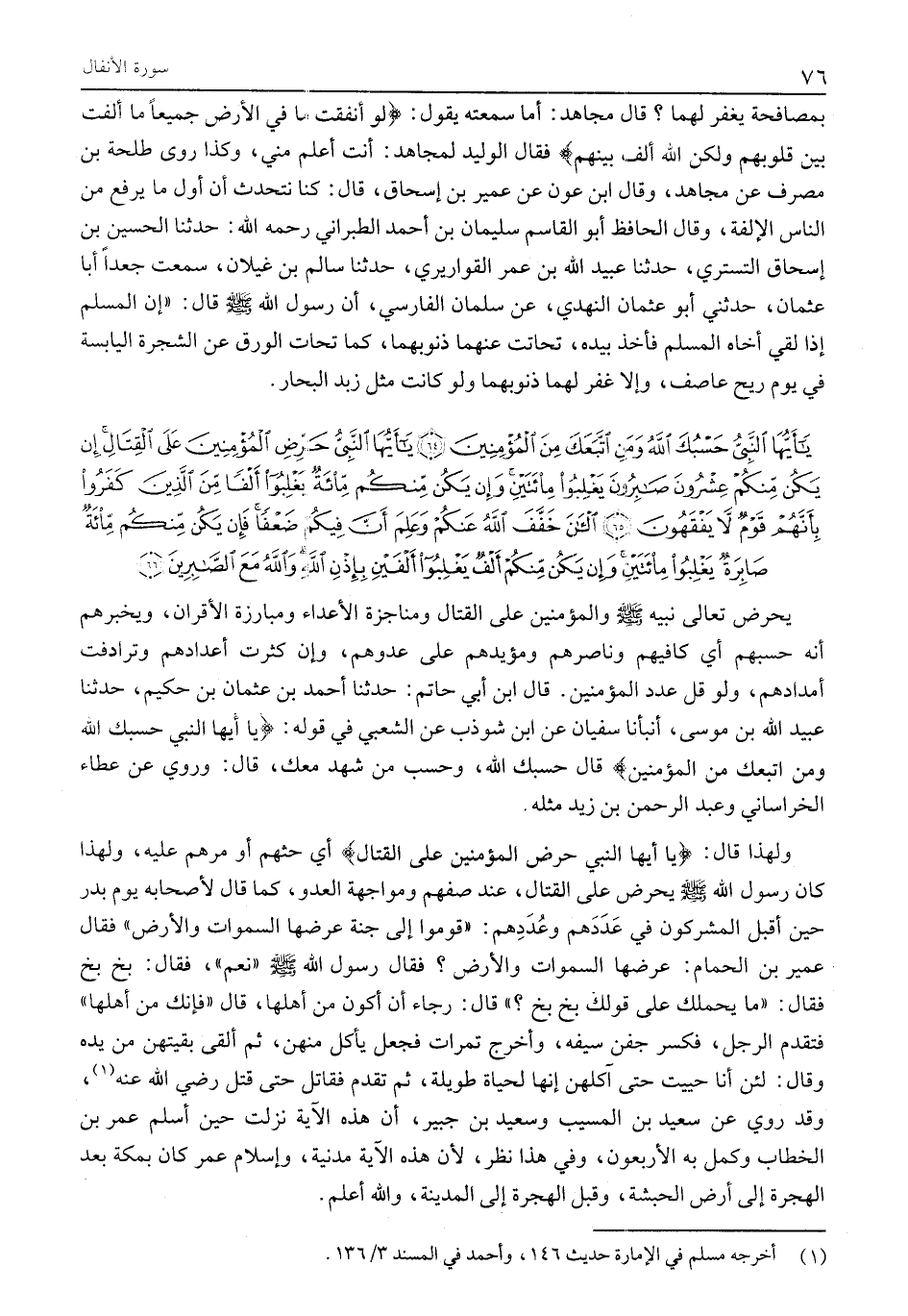 يَا أَيُّهَا النَّبِيُّ حَسْبُكَ اللَّهُ وَمَنِ اتَّبَعَكَ مِنَ الْمُؤْمِنِينَ (64) يَا أَيُّهَا النَّبِيُّ حَرِّضِ الْمُؤْمِنِينَ عَلَى الْقِتالِ إِنْ يَكُنْ مِنْكُمْ عِشْرُونَ صابِرُونَ يَغْلِبُوا مِائَتَيْنِ وَإِنْ يَكُنْ مِنْكُمْ مِائَةٌ يَغْلِبُوا أَلْفاً مِنَ الَّذِينَ كَفَرُوا بِأَنَّهُمْ قَوْمٌ لَا يَفْقَهُونَ (65) الْآنَ خَفَّفَ اللَّهُ عَنْكُمْ وَعَلِمَ أَنَّ فِيكُمْ ضَعْفاً فَإِنْ يَكُنْ مِنْكُمْ مِائَةٌ صابِرَةٌ يَغْلِبُوا مِائَتَيْنِ وَإِنْ يَكُنْ مِنْكُمْ أَلْفٌ يَغْلِبُوا أَلْفَيْنِ بِإِذْنِ اللَّهِ وَاللَّهُ مَعَ الصَّابِرِينَ (66)