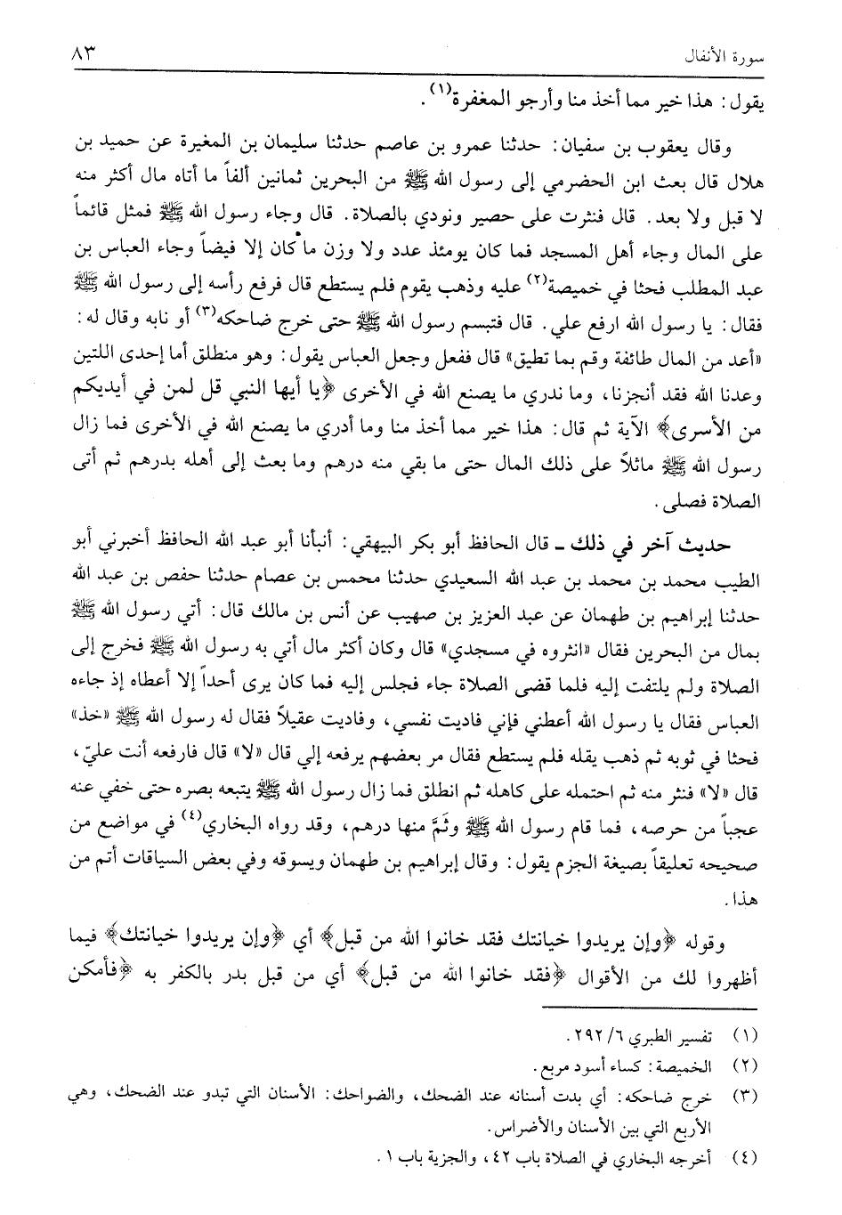 حَدِيثٌ آخَرُ فِي ذَلِكَ- قَالَ الْحَافِظُ أَبُو بَكْرٍ الْبَيْهَقِيُّ: أَنْبَأَنَا أَبُو عَبْدِ اللَّهِ الْحَافِظُ أَخْبَرَنِي أَبُو الطَّيِّبِ مُحَمَّدُ بْنُ مُحَمَّدِ بْنِ عَبْدِ اللَّهِ السَّعِيدِيُّ حَدَّثَنَا محمد بْنُ عِصَامٍ حَدَّثَنَا حَفْصُ بْنُ عَبْدِ اللَّهِ حَدَّثَنَا إِبْرَاهِيمُ بْنُ طَهْمَانَ عَنْ عَبْدِ الْعَزِيزِ بْنِ صُهَيْبٍ عَنْ أَنَسِ بْنِ مَالِكٍ قَالَ: أَتَى رَسُولَ اللَّهِ صَلَّى اللَّهُ عَلَيْهِ وَسَلَّمَ بمال من البحرين فقال «انثروه في مسجدي» قَالَ وَكَانَ أَكْثَرُ مَالٍ أُتِيَ بِهِ رَسُولُ اللَّهِ صَلَّى اللَّهُ عَلَيْهِ وَسَلَّمَ فَخَرَجَ إِلَى الصَّلَاةِ وَلَمْ يَلْتَفِتْ إِلَيْهِ فَلَمَّا قَضَى الصَّلَاةَ جَاءَ فَجَلَسَ إِلَيْهِ فَمَا كَانَ يَرَى أَحَدًا إلا أعطاه إذ جاءه الْعَبَّاسُ فَقَالَ يَا رَسُولَ اللَّهِ أَعْطِنِي فَإِنِّي فَادَيْتُ نَفْسِي، وَفَادَيْتُ عَقِيلًا فَقَالَ لَهُ رَسُولُ اللَّهِ صَلَّى اللَّهُ عَلَيْهِ وَسَلَّمَ «خُذْ» فَحَثَا فِي ثَوْبِهِ ثُمَّ ذَهَبَ يُقِلُّهُ فَلَمْ يَسْتَطِعْ فَقَالَ مُرْ بَعْضَهُمْ يَرْفَعُهُ إِلَيَّ قَالَ «لَا» قَالَ فَارْفَعْهُ أَنْتَ عَلَيَّ، قَالَ «لَا» فَنَثَرَ مِنْهُ ثُمَّ احْتَمَلَهُ عَلَى كَاهِلِهِ ثُمَّ انْطَلَقَ فَمَا زَالَ رَسُولُ اللَّهِ صَلَّى اللَّهُ عَلَيْهِ وَسَلَّمَ يُتْبِعُهُ بَصَرَهُ حَتَّى خَفِيَ عَنْهُ عَجَبًا مِنْ حِرْصِهِ، فَمَا قَامَ رَسُولُ اللَّهِ صَلَّى اللَّهُ عَلَيْهِ وَسَلَّمَ وَثَمَّ مِنْهَا دِرْهَمٌ، وَقَدْ رَوَاهُ الْبُخَارِيُّ «4» فِي مَوَاضِعَ مِنْ صَحِيحِهِ تَعْلِيقًا بِصِيغَةِ الْجَزْمِ يَقُولُ: وَقَالَ إِبْرَاهِيمُ بْنُ طَهْمَانَ وَيَسُوقُهُ وَفِي بَعْضِ السِّيَاقَاتِ أَتَمُّ مِنْ هَذَا.