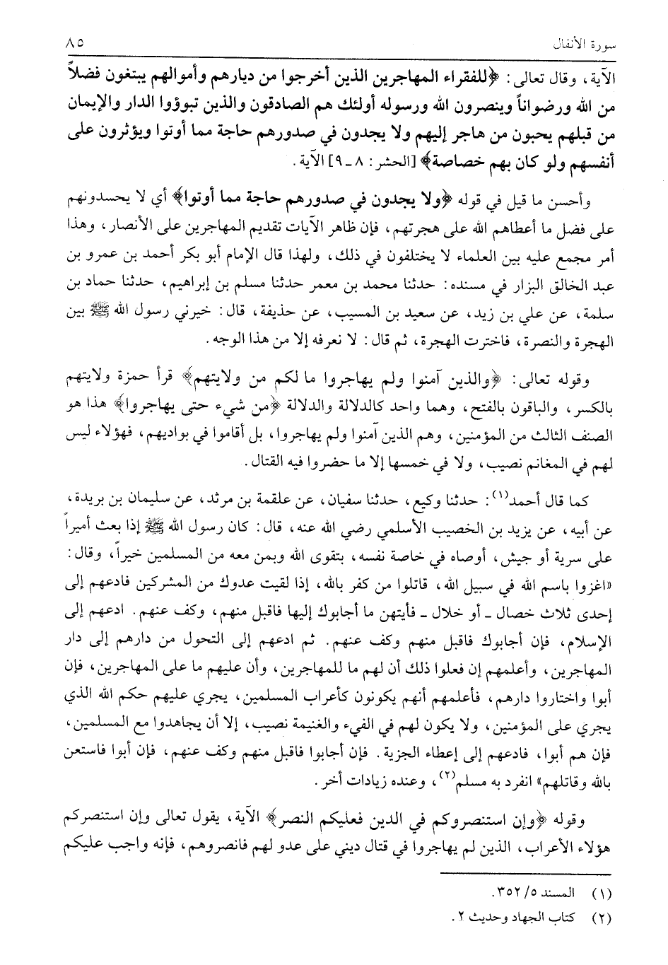 الآية، وَقَالَ تَعَالَى: لِلْفُقَراءِ الْمُهاجِرِينَ الَّذِينَ أُخْرِجُوا مِنْ دِيارِهِمْ وَأَمْوالِهِمْ يَبْتَغُونَ فَضْلًا مِنَ اللَّهِ وَرِضْواناً وَيَنْصُرُونَ اللَّهَ وَرَسُولَهُ أُولئِكَ هُمُ الصَّادِقُونَ وَالَّذِينَ تَبَوَّؤُا الدَّارَ وَالْإِيمانَ مِنْ قَبْلِهِمْ يُحِبُّونَ مَنْ هاجَرَ إِلَيْهِمْ وَلا يَجِدُونَ فِي صُدُورِهِمْ حاجَةً مِمَّا أُوتُوا وَيُؤْثِرُونَ عَلى أَنْفُسِهِمْ وَلَوْ كانَ بِهِمْ خَصاصَةٌ [الحشر: 8- 9] الآية.