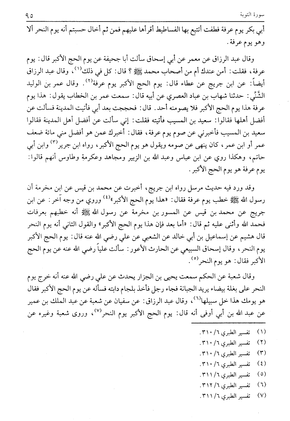 أَبِي بَكْرٍ يَوْمَ عَرَفَةَ فَطُفْتُ أَتَتَبَّعُ بِهَا الفساطيط أقرأها عَلَيْهِمْ فَمِنْ ثَمَّ إِخَالُ حَسِبْتُمْ أَنَّهُ يَوْمُ النَّحْرِ أَلَا وَهُوَ يَوْمُ عَرَفَةَ.