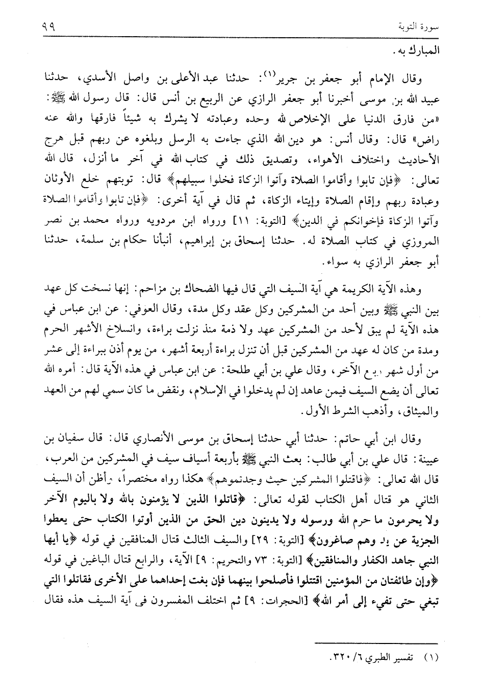 «مَنْ فَارَقَ الدُّنْيَا عَلَى الْإِخْلَاصِ لِلَّهِ وَحْدَهُ وَعِبَادَتِهِ لَا يُشْرِكُ بِهِ شَيْئًا فَارَقَهَا وَاللَّهُ عَنْهُ رَاضٍ» قَالَ: وَقَالَ أَنَسٌ: هُوَ دِينُ اللَّهِ الَّذِي جَاءَتْ بِهِ الرُّسُلُ وَبَلَّغُوهُ عَنْ رَبِّهِمْ قَبْلَ هَرْجِ الْأَحَادِيثِ وَاخْتِلَافِ الْأَهْوَاءِ، وَتَصْدِيقُ ذَلِكَ فِي كِتَابِ اللَّهِ فِي آخِرِ مَا أُنْزِلَ، قَالَ اللَّهُ تَعَالَى: فَإِنْ تابُوا وَأَقامُوا الصَّلاةَ وَآتَوُا الزَّكاةَ فَخَلُّوا سَبِيلَهُمْ قَالَ: تَوْبَتُهُمْ خَلْعُ الْأَوْثَانِ وَعِبَادَةُ رَبِّهِمْ وَإِقَامُ الصَّلَاةِ وَإِيتَاءُ الزَّكَاةِ، ثُمَّ قَالَ فِي آيَةٍ أُخْرَى: فَإِنْ تابُوا وَأَقامُوا الصَّلاةَ وَآتَوُا الزَّكاةَ فَإِخْوانُكُمْ فِي الدِّينِ [التَّوْبَةِ: 11] وَرَوَاهُ ابْنُ مَرْدَوَيْهِ وَرَوَاهُ مُحَمَّدُ بْنُ نَصْرٍ الْمَرْوَزِيُّ فِي كِتَابِ الصَّلَاةِ لَهُ. حَدَّثَنَا إِسْحَاقُ بْنُ إِبْرَاهِيمَ، أَنْبَأَنَا حكام بن سلمة، حَدَّثَنَا أَبُو جَعْفَرٍ الرَّازِيُّ بِهِ سَوَاءً.