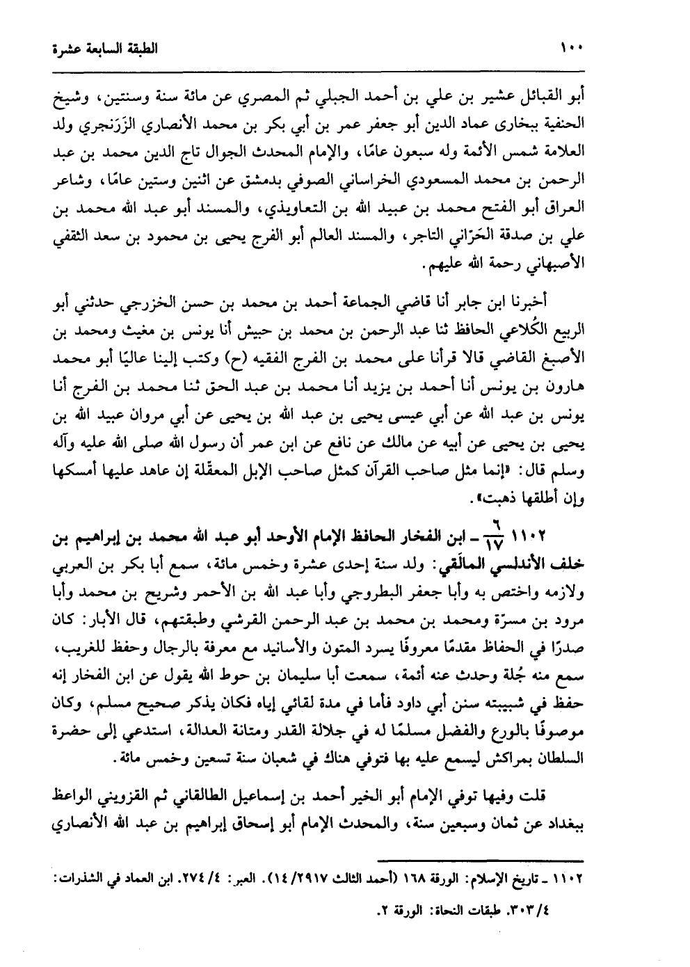 1102- 6/17- ابن الفخار الحافظ الإمام الأوحد أبو عبد الله محمد بن إبراهيم بن خلف الأندلسي المالقي: ولد سنة إحدى عشرة وخمسمائة، سمع أبا بكر بن العربي ولازمه واختص به وأبا جعفر البطروجي وأبا عبد الله بن الأحمر وشريح بن محمد وأبا مرود بن مسرّة ومحمد بن محمد بن عبد الرحمن القرشي وطبقتهم، قال الأبار: كان صدرًا في الحفاظ مقدمًا معروفًا يسرد المتون والأسانيد مع معرفة بالرجال وحفظ للغريب، سمع منه جُلة وحدث عنه أئمة، سمعت أبا سليمان بن حوط الله يقول عن ابن الفخار: إنه حفظ في شبيبته سنن أبي داود فأما في مدة لقائي إياه فكان يذكر صحيح مسلم، وكان موصوفًا بالورع والفضل مسلمًا له في جلالة القدر ومتانة العدالة، استدعي إلى حضرة السلطان بمراكش ليسمع عليه بها فتوفي هناك في شعبان سنة تسعين وخمسمائة.