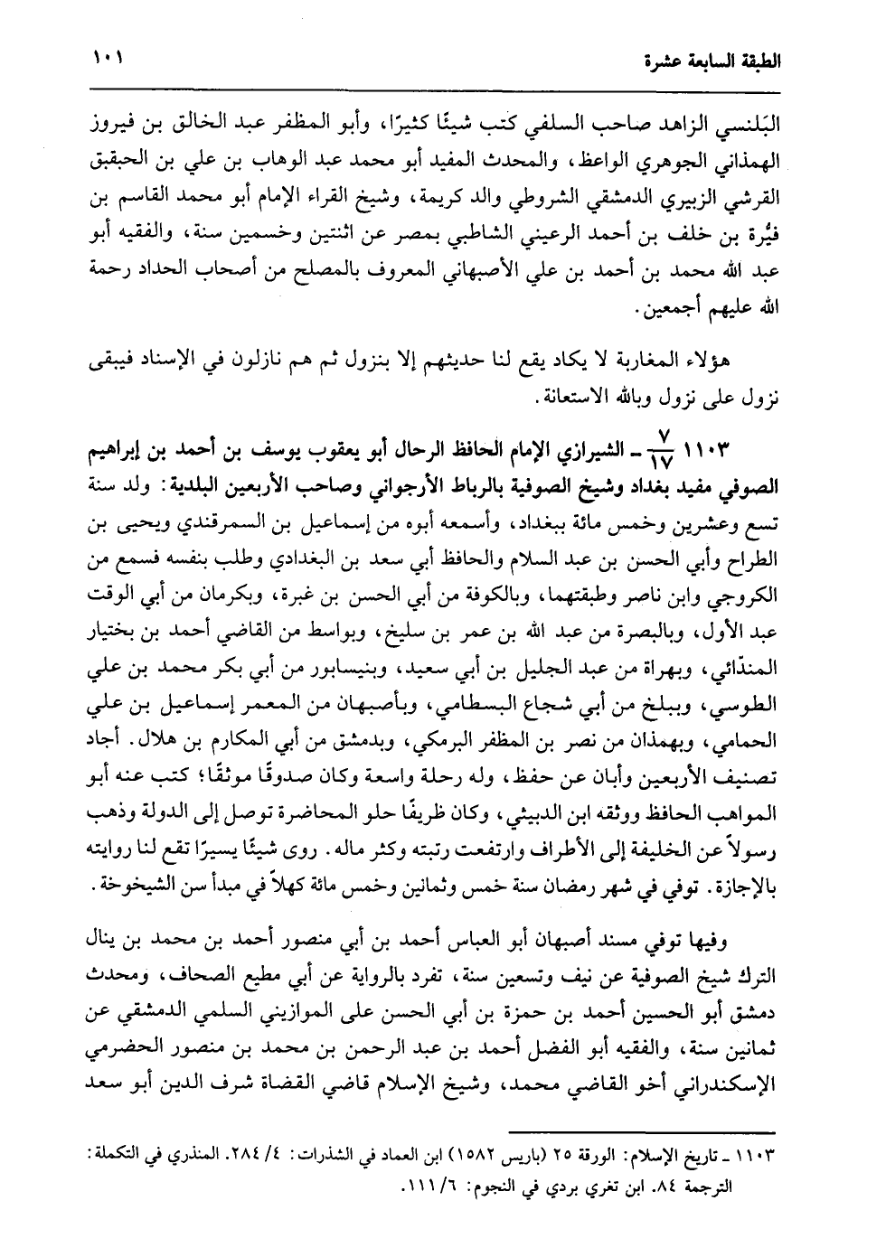 1103- 7/17- الشيرازي الإمام الحافظ الرحال أبو يعقوب يوسف بن أحمد بن إبراهيم الصوفي مفيد بغداد وشيخ الصوفية بالرباط الأرجواني وصاحب الأربعين البلدية: ولد سنة تسع وعشرين وخمسمائة ببغداد، وأسمعه أبوه من إسماعيل بن السمرقندي ويحيى بن الطراح وأبي الحسن بن عبد السلام والحافظ أبي سعد بن البغدادي وطلب بنفسه فسمع من الكروجي وابن ناصر وطبقتهما، وبالكوفة من أبي الحسن بن غبرة، وبكرمان من أبي الوقت عبد الأول، وبالبصرة من عبد الله بن عمر بن سليخ، وبواسط من القاضي أحمد بن بختيار المندّائي، وبهراة من عبد الجليل بن أبي سعيد، وبنيسابور من أبي بكر محمد بن علي الطوسي، وببلخ من أبي شجاع البسطامي، وبأصبهان من المعمر إسماعيل بن علي الحمامي، وبهمذان من نصر بن المظفر البرمكي، وبدمشق من أبي المكارم بن هلال. أجاد تصنيف الأربعين وأبان عن حفظ، وله رحلة واسعة وكان صدوقًا موثقًا؛ كتب عنه أبو المواهب الحافظ ووثقه ابن الدبيثي؛ وكان ظريفًا حلو المحاضرة توصل إلى الدولة وذهب رسولا عن الخليفة إلى الأطراف وارتفعت رتبته وكثر ماله, روى شيئًا يسيرًا تقع لنا روايته بالإجازة. توفي في شهر رمضان سنة خمس وثمانين وخمسمائة كهلا في مبدأ سن الشيخوخة.