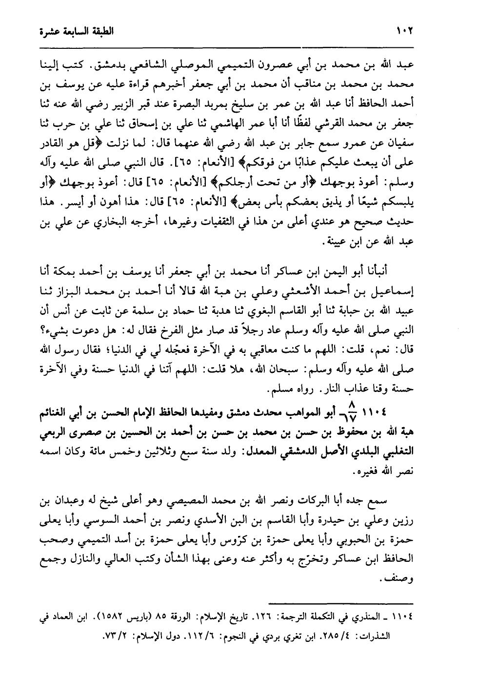 1104- المنذري في التكملة الترجمة: 126. تاريخ الإسلام: الورقة 85 "باريس 1582". ابن العماد في الشذرات: 4/ 285. ابن تغري بردي في النجوم: 6/ 112. دول الإسلام: 2/ 73.