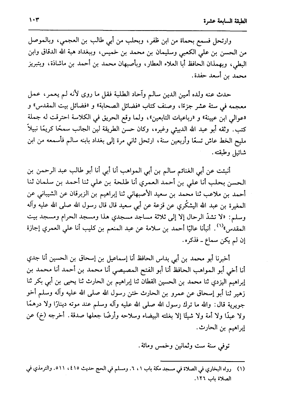 أنبئت عن أبي الغنائم سالم بن أبي المواهب أنا أبي أنا أبو طالب عبد الرحمن بن الحسن بحلب أنا علي بن أحمد العمري أنا طلحة بن علي ثنا أحمد بن سلمان ثنا أحمد بن ملاعب ثنا محمد بن سعيد الأصبهاني ثنا إبراهيم بن الزبرقان عن الشيباني عن المغيرة بن عبد الله اليشكُري عن قزعة عن أبي سعيد قال: قال رسول الله, صلى الله عليه وآله وسلم: "لا تشدّ الرحال إلا إلى ثلاثة مساجد: مسجدي هذا, ومسجد الحرام, ومسجد بيت المقدس" 1. أنبأنا عاليًا أحمد بن سلامة عن عبد المنعم بن كليب أنا علي العمري إجازة إن لم يكن سماع, فذكره.