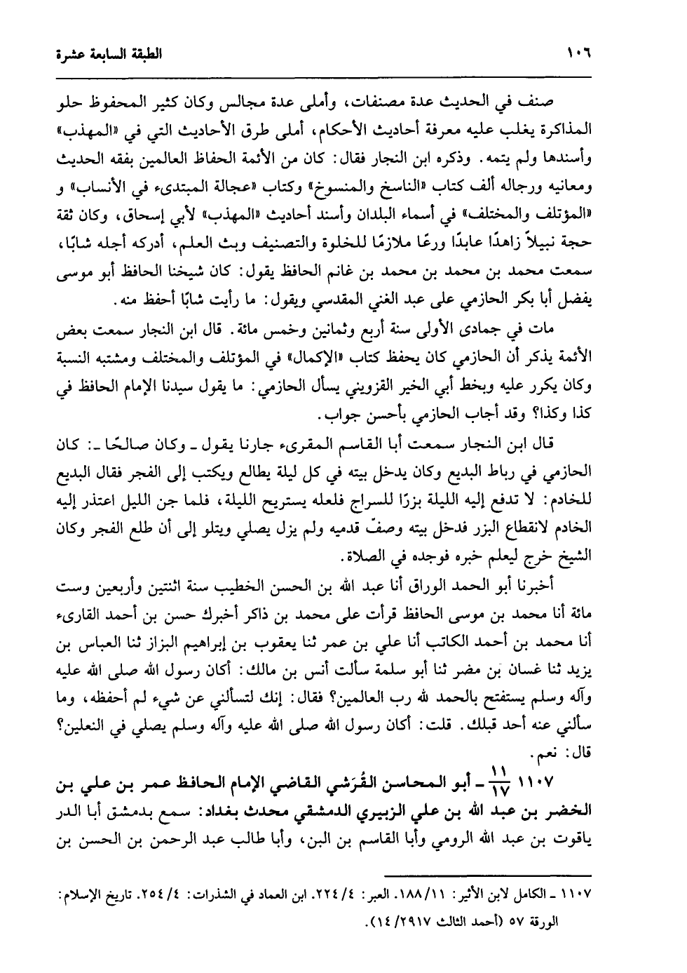 1107- 11/17- أبو المحاسن القُرَشي القاضي الإمام الحافظ عمر بن علي بن الخضر بن عبد الله بن علي الزبيري الدمشقي محدث بغداد: سمع بدمشق أبا الدر ياقوت بن عبد الله الرومي, وأبا القاسم بن البن، وأبا طالب عبد الرحمن بن الحسن بن