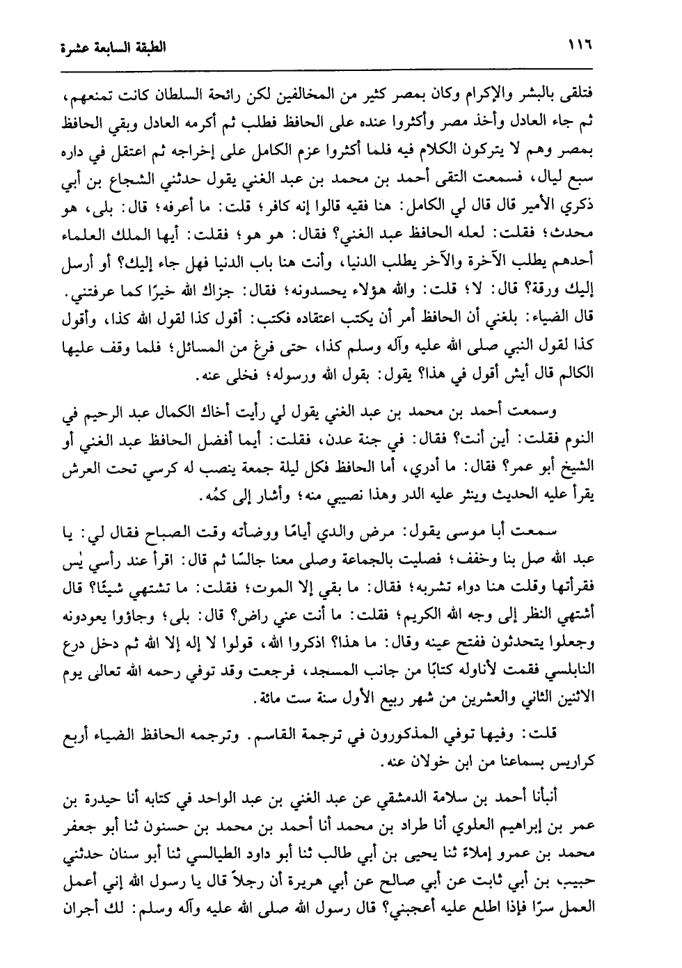 وسمعت أحمد بن محمد بن عبد الغني يقول لي: رأيت أخاك الكمال عبد الرحيم في النوم فقلت: أين أنت؟ فقال: في جنة عدن، فقلت: أيما أفضل الحافظ عبد الغني أو الشيخ أبو عمر؟ فقال: ما أدري, أما الحافظ فكل ليلة جمعة ينصب له كرسي تحت العرش يقرأ عليه الحديث وينثر عليه الدر وهذا نصيبي منه؛ وأشار إلى كمه.