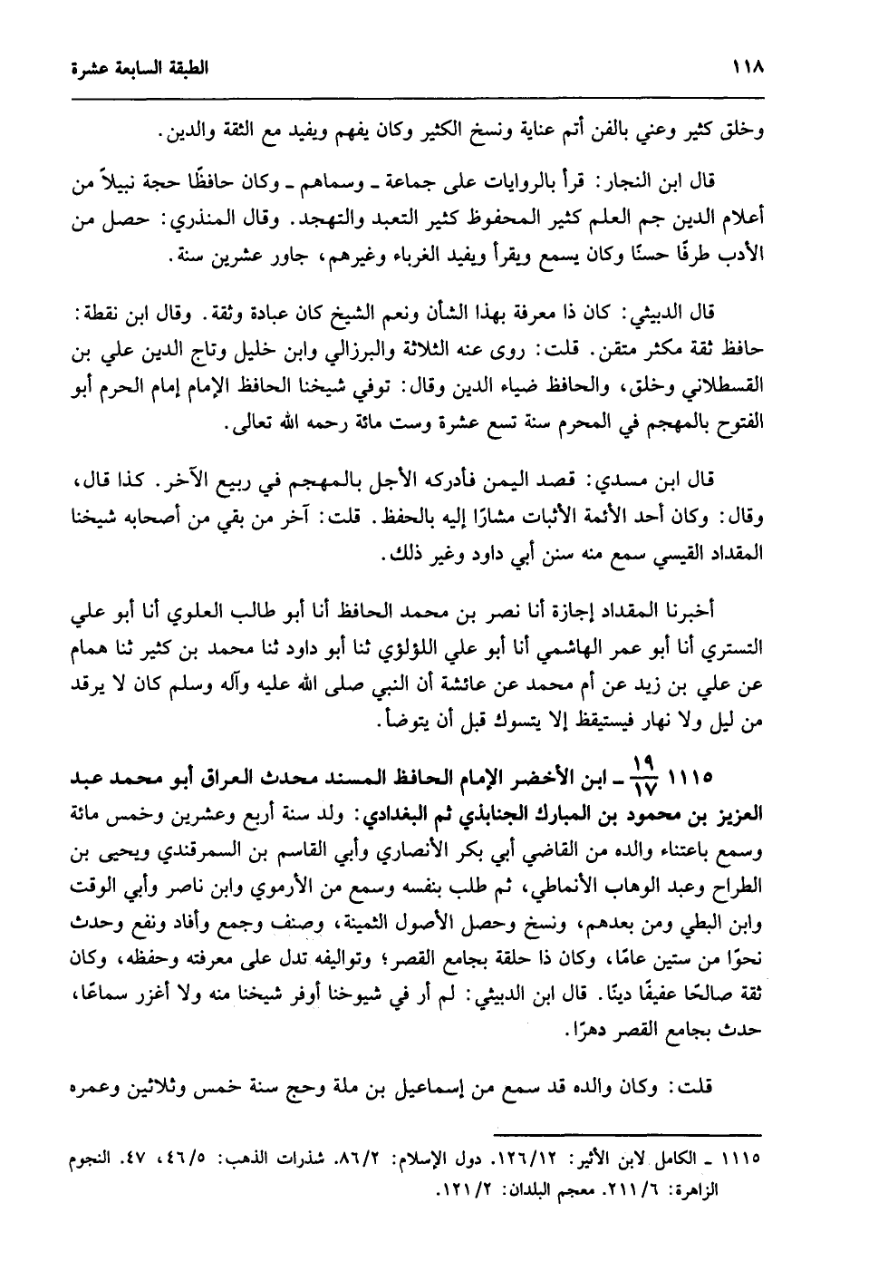 1115- 19/17- ابن الأخضر الإمام الحافظ المسند محدث العراق, أبو محمد عبد العزيز بن محمود بن المبارك الجنابذي ثم البغدادي: ولد سنة أربع وعشرين وخمسمائة وسمع باعتناء والده من القاضي أبي بكر الأنصاري وأبي القاسم بن السمرقندي ويحيى بن الطراح وعبد الوهاب الأنماطي، ثم طلب بنفسه وسمع من الأرموي وابن ناصر وأبي الوقت وابن البطي ومن بعدهم، ونسخ وحصل الأصول الثمينة، وصنف وجمع وأفاد ونفع وحدث نحوًا من ستين عامًا، وكان ذا حلقة بجامع القصر؛ وتواليفه تدل على معرفته وحفظه، وكان ثقة صالحًا عفيفًا دينًا. قال ابن الدبيثي: لم أر في شيوخنا أوفر شيوخًا منه ولا أغزر سماعًا، حدث بجامع القصر دهرًا.