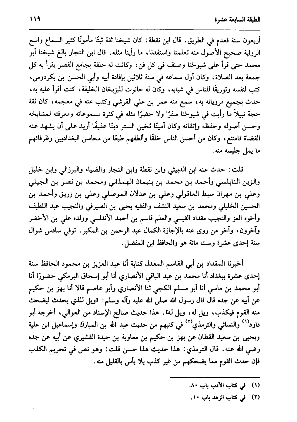 أخبرنا المقداد بن أبي القاسم المعدل كتابة أنا عبد العزيز بن محمود الحافظ سنة إحدى عشرة ببغداد أنا محمد بن عبد الباقي الأنصاري أنا أبو إسحاق البرمكي حضورًا أنا أبو محمد بن ماسي أنا أبو مسلم الكجي ثنا الأنصاري وأبو عاصم قالا: أنا بهز بن حكيم عن أبيه عن جده قال: قال رسول الله, صلى الله عليه وآله وسلم: "ويل للذي يحدث ليضحك منه القوم فيكذب، ويل له، ويل له". هذا حديث صالح الإسناد من العوالي، أخرجه أبو داود1 والنسائي والترمذي2 في كتبهم من حديث عبد الله بن المبارك وإسماعيل بن علية ويحيى بن سعيد القطان عن بهز بن حكيم بن معاوية بن حيدة القشيري عن أبيه عن جده, رضي الله عنه. قال الترمذي: هذا حديث, هذا حسن قلت: وهو نص في تحريم الكذب, فإن حدث القوم مما يضحكهم من غير كذب فلا بأس بالقليل منه.