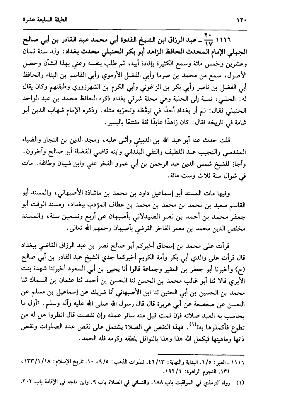 1116- 20/17- عبد الرزاق ابن الشيخ القدوة أبي محمد عبد القادر بن أبي صالح الجيلي الإمام المحدث الحافظ الزاهد, أبو بكر الحنبلي, محدث بغداد: ولد سنة ثمان وعشرين وخمسمائة وسمع الكثير بإفادة أبيه، ثم طلب بنفسه وعني بهذا الشأن وحصل الأصول، سمع من محمد بن صرما وأبي الفضل الأرموي وأبي القاسم بن البناء والحافظ أبي الفضل بن ناصر وأبي بكر بن الزغواني وأبي الكرم بن الشهرزوري وطبقتهم وكان يقال له: الحلبي، نسبه إلى الحلبة وهي محلة شرقي بغداد, ذكره الحافظ محمد بن عبد الواحد الحنبلي فقال: لم أر ببغداد أحدًا في تيقظه وتحريه مثله. وذكره الإمام شهاب الدين أبو شامة في تاريخه فقال: كان زاهدًا عابدًا ثقة مقتنعًا باليسير.