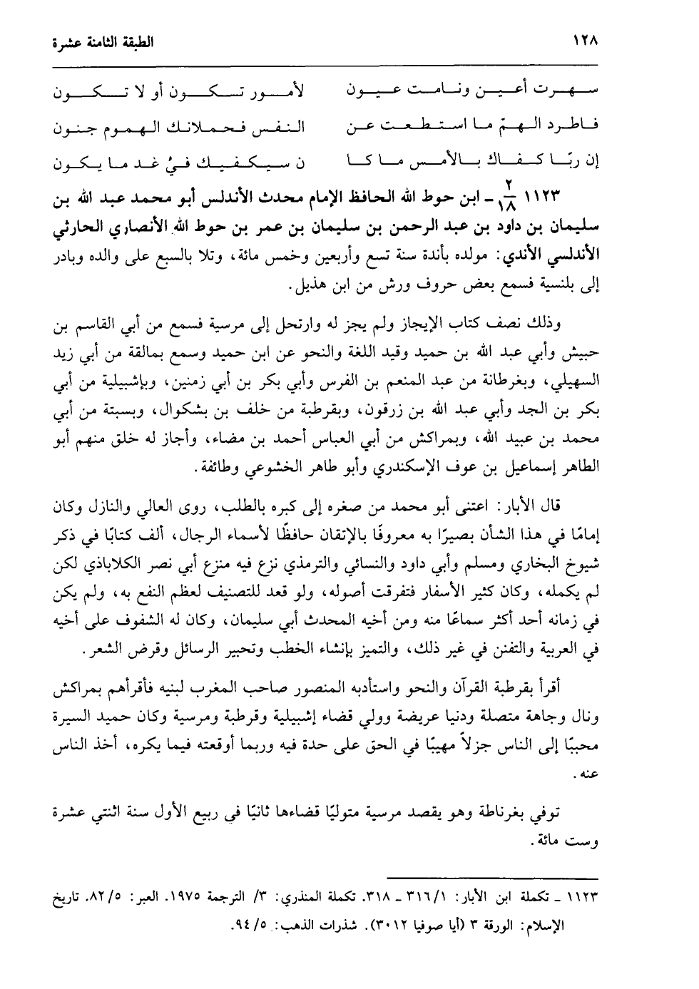 1123- تكملة ابن الأبار: 1/ 316-318. تكملة المذري: 3/ الترجمة 1975. العبر: 5/ 82. تاريخ الإسلام: الورقة 3 "أيا صوفيا 3012". شذرات الذهب: 5/ 94.