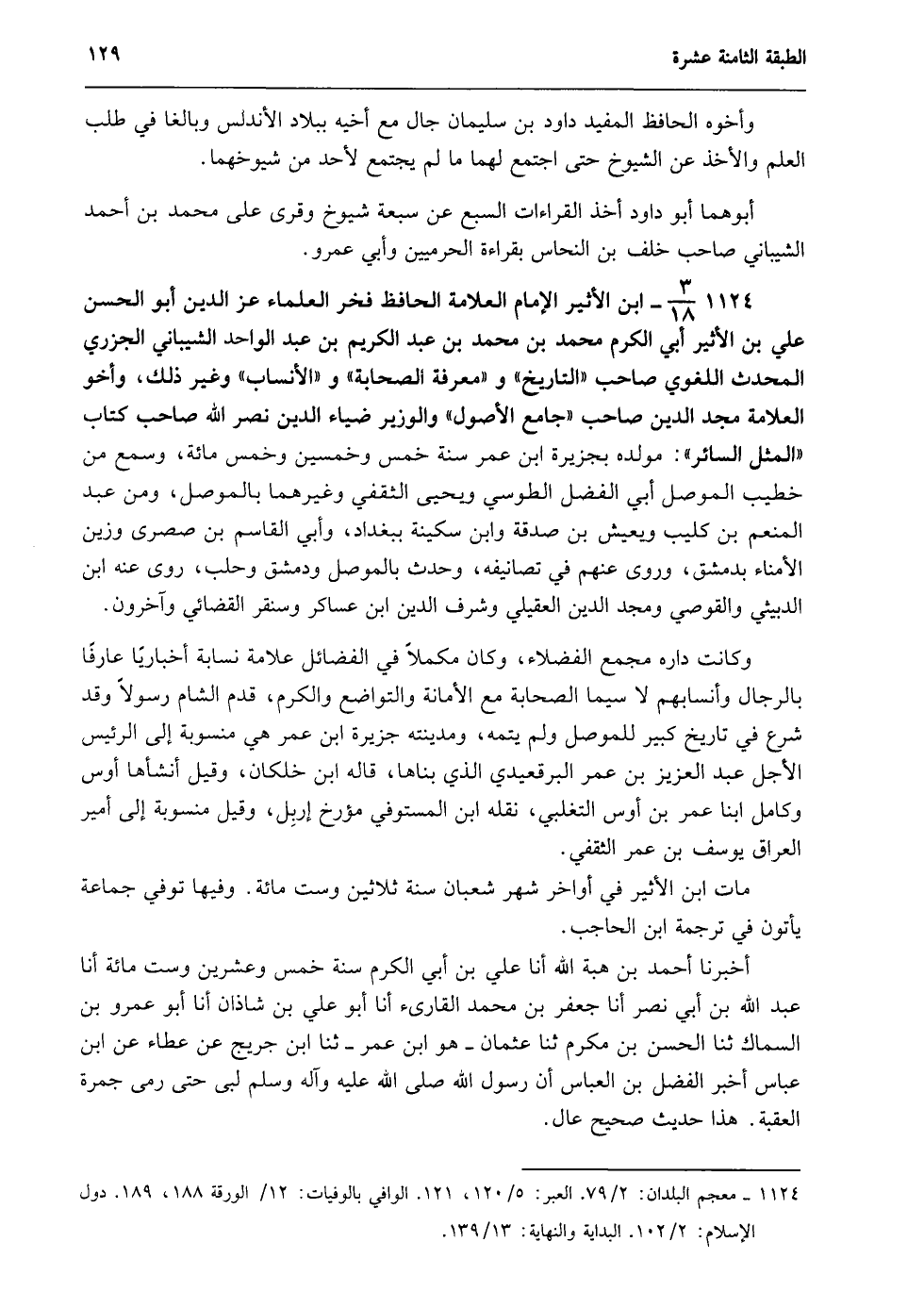 1124- 3/18- ابن الأثير الإمام العلامة الحافظ فخر العلماء عز الدين أبو الحسن علي بن الأثير أبي الكرم محمد بن محمد بن عبد الكريم بن عبد الواحد الشيباني الجزري المحدث اللغوي صاحب "التاريخ" و"معرفة الصحابة" و"الأنساب" وغير ذلك، وأخو العلامة مجد الدين صاحب "جامع الأصول" والوزير ضياء الدين نصر الله صاحب كتاب "المثل السائر": مولده بجزيرة ابن عمر سنة خمس وخمسين وخمسمائة، وسمع من خطيب الموصل أبي الفضل الطوسي ويحيى الثقفي وغيرهما بالموصل، ومن عبد المنعم بن كليب ويعيش بن صدقة وابن سكينة ببغداد، وأبي القاسم بن صصرى وزين الأمناء بدمشق، وروى عنهم في تصانيفه، وحدث بالموصل ودمشق وحلب، روى عنه ابن الدبيثي والقوصي ومجد الدين العقيلي وشرف الدين ابن عساكر وسنقر القضائي وآخرون.