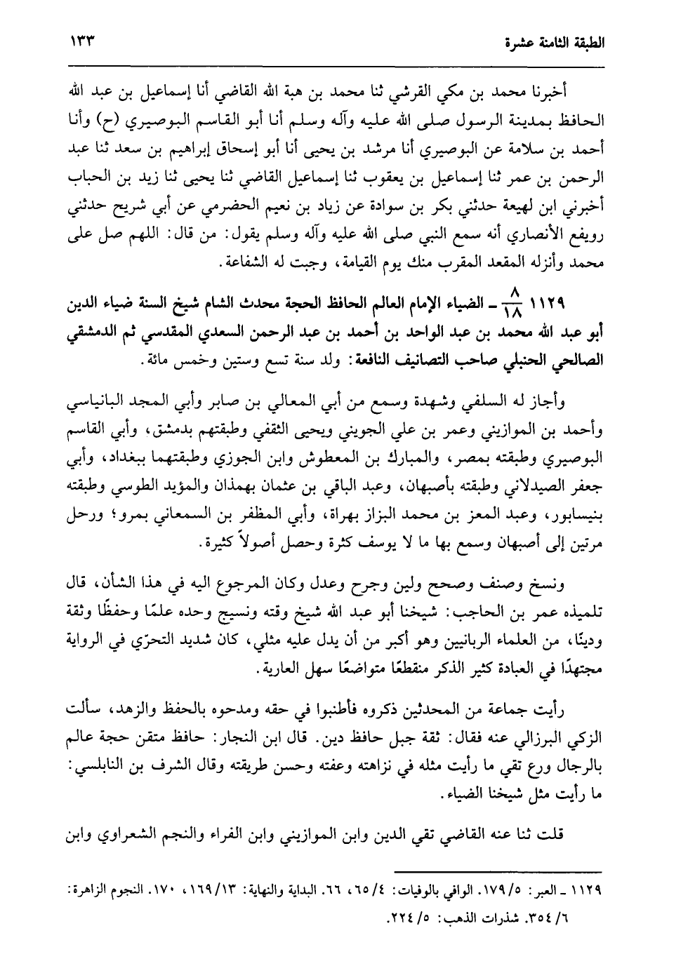 1129- 8/18- الضياء الإمام العالم الحافظ الحجة محدث الشام شيخ السنة ضياء الدين أبو عبد الله محمد بن عبد الواحد بن أحمد بن عبد الرحمن السعدي المقدسي ثم الدمشقي, الصالحي الحنبلي, صاحب التصانيف النافعة: ولد سنة تسع وستين وخمسمائة.
