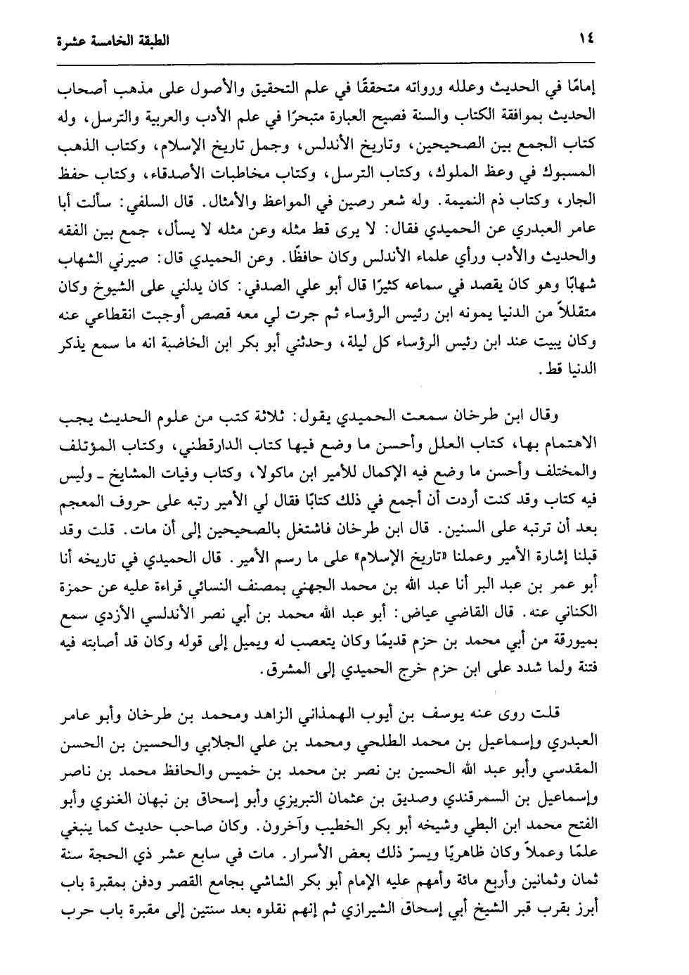 وقال بن طرخان: سمعت الحميدي يقول: ثلاثة كتب من علوم الحديث يجب الاهتمام بها؛ كتاب العلل وأحسن ما وضع فيها كتاب الدارقطني، وكتاب المؤتلف والمختلف وأحسن ما وضع فيه الإكمال للأمير بن ماكولا، وكتاب وفيات المشايخ, وليس فيه كتاب, وقد كنت أردت أن أجمع في ذلك كتابًا فقال لي الأمير: رتبه على حروف المعجم بعد أن ترتبه على السنين. قال بن طرخان: فاشتغل بالصحيحين إلى أن مات. قلت: وقد قبلنا إشارة الأمير وعملنا "تاريخ الإسلام" على ما رسم الأمير. قال الحميدي في تاريخه: أنا أبو عمر بن عبد البر أنا عبد الله بن محمد الجهني بمصنف النسائي قراءة عليه عن حمزة الكناني عنه. قال القاضي عياض: أبو عبد الله محمد بن أبي نصر الأندلسي الأزدي سمع بميورقة من أبي محمد بن حزم قديمًا وكان يتعصب له ويميل إلى قوله وكان قد أصابته فيه فتنة ولما شدد على بن حزم خرج الحميدي إلى المشرق.