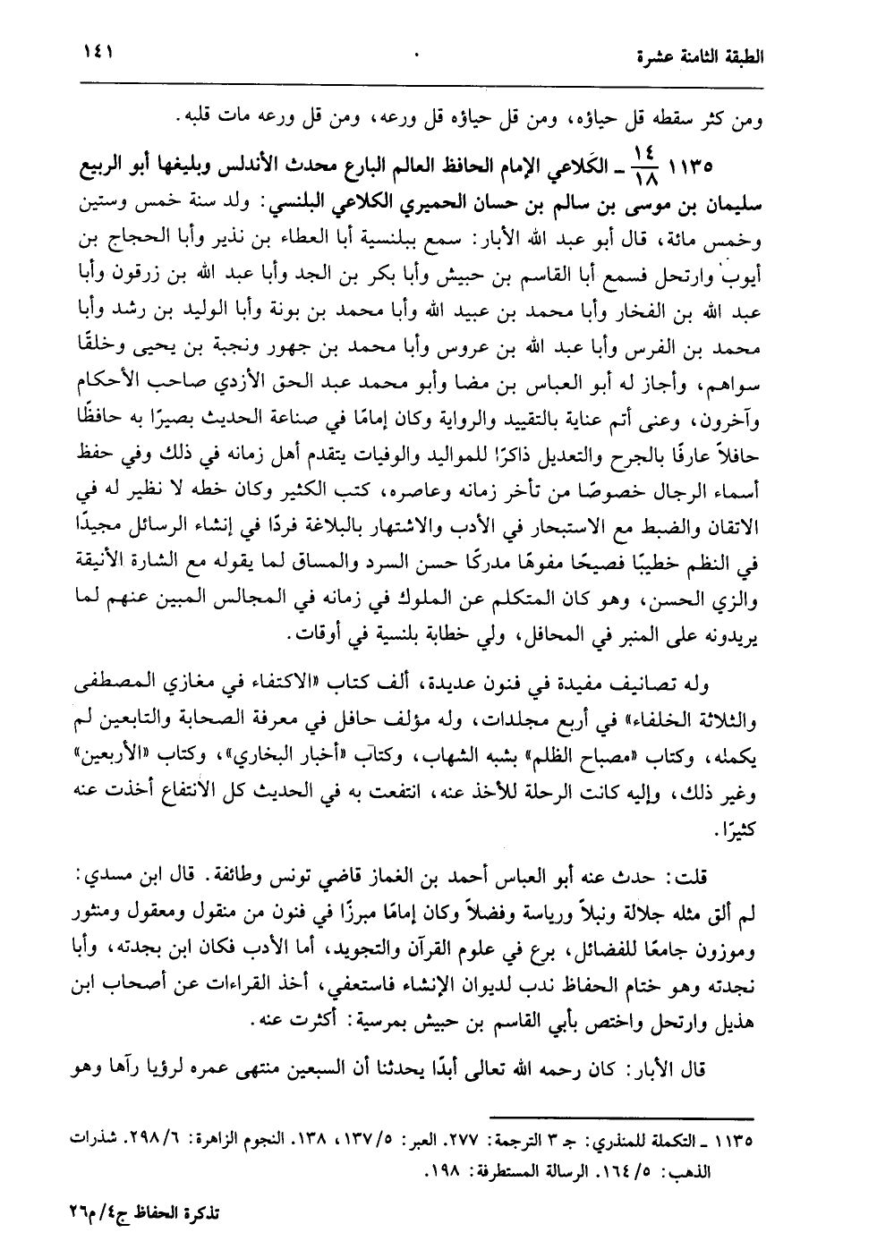 1135- 14/18- الكلاعي الإمام الحافظ العالم البارع محدث الأندلس وبليغها, أبو الربيع سليمان بن موسى بن سالم بن حسان الحميري الكلاعي البلنسي: ولد سنة خمس وستين وخمسمائة، قال أبو عبد الله الأبار: سمع ببلنسية أبا العطاء بن نذير وأبا الحجاج بن أيوب وارتحل فسمع أبا القاسم بن حبيش وأبا بكر بن الجد وأبا عبد الله بن زرقون وأبا عبد الله بن الفخار وأبا محمد بن عبيد الله وأبا محمد بن بونة وأبا الوليد بن رشد وأبا محمد بن الفرس وأبا عبد الله بن عروس وأبا محمد بن جهور ونجبة بن يحيى وخلقًا سواهم، وأجاز له أبو العباس بن مضا وأبو محمد عبد الحق الأزدي صاحب الأحكام وآخرون، وعني أتم عناية بالتقييد والرواية وكان إمامًا في صناعة الحديث بصيرًا به حافظًا حافلًا عارفًا بالجرح والتعديل ذاكرًا للمواليد والوفيات يتقدم أهل زمانه في ذلك وفي حفظ أسماء الرجال خصوصًا من تأخر زمانه وعاصره، كتب الكثير وكان خطه لا نظير له في الإتقان والضبط مع الاستبحار في الأدب والاشتهار بالبلاغة فردًا في إنشاء الرسائل مجيدًا في النظم خطيبًا فصيحًا مفوهًا مدركًا حسن السرد والمساق لما يقوله مع الشارة الأنيقة والزي الحسن، وهو كان المتكلم عن الملوك في زمانه في المجالس المبين عنهم لما يريدونه على المنبر في المحافل، ولي خطابة بلنسية في أوقات.