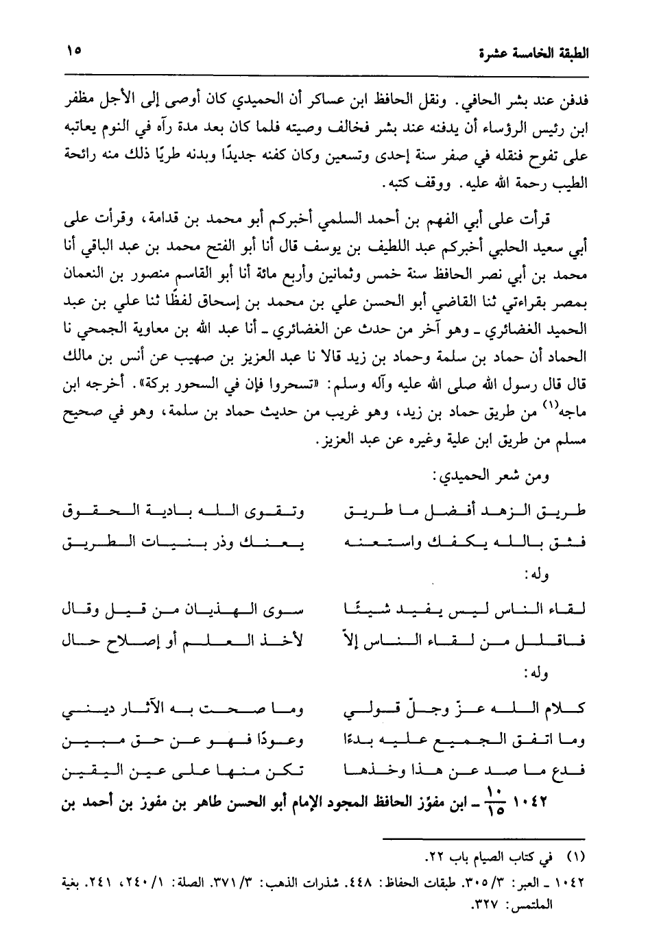 قرأت على أبي الفهم بن أحمد السلمي أخبركم أبو محمد بن قدامة، وقرأت على أبي سعيد الحلبي أخبركم عبد اللطيف بن يوسف قال: أنا أبو الفتح محمد بن عبد الباقي أنا محمد بن أبي نصر الحافظ سنة خمس وثمانين وأربعمائة أنا أبو القاسم منصور بن النعمان بمصر بقراءتي ثنا القاضي أبو الحسن علي بن محمد بن إسحاق لفظًا ثنا علي بن عبد الحميد الغضائري -وهو آخر من حدث عن الغضائري- أنا عبد الله بن معاوية الجمحي نا الحماد أن حماد بن سلمة وحماد بن زيد قالا: نا عبد العزيز بن صهيب عن أنس بن مالك قال: قال رسول الله, صلى الله عليه وآله وسلم: "تسحروا؛ فإن في السحور بركة". أخرجه بن ماجه1 من طريق حماد بن زيد، وهو غريب من حديث حماد بن سلمة، وهو في صحيح مسلم من طريق بن علية وغيره عن عبد العزيز.