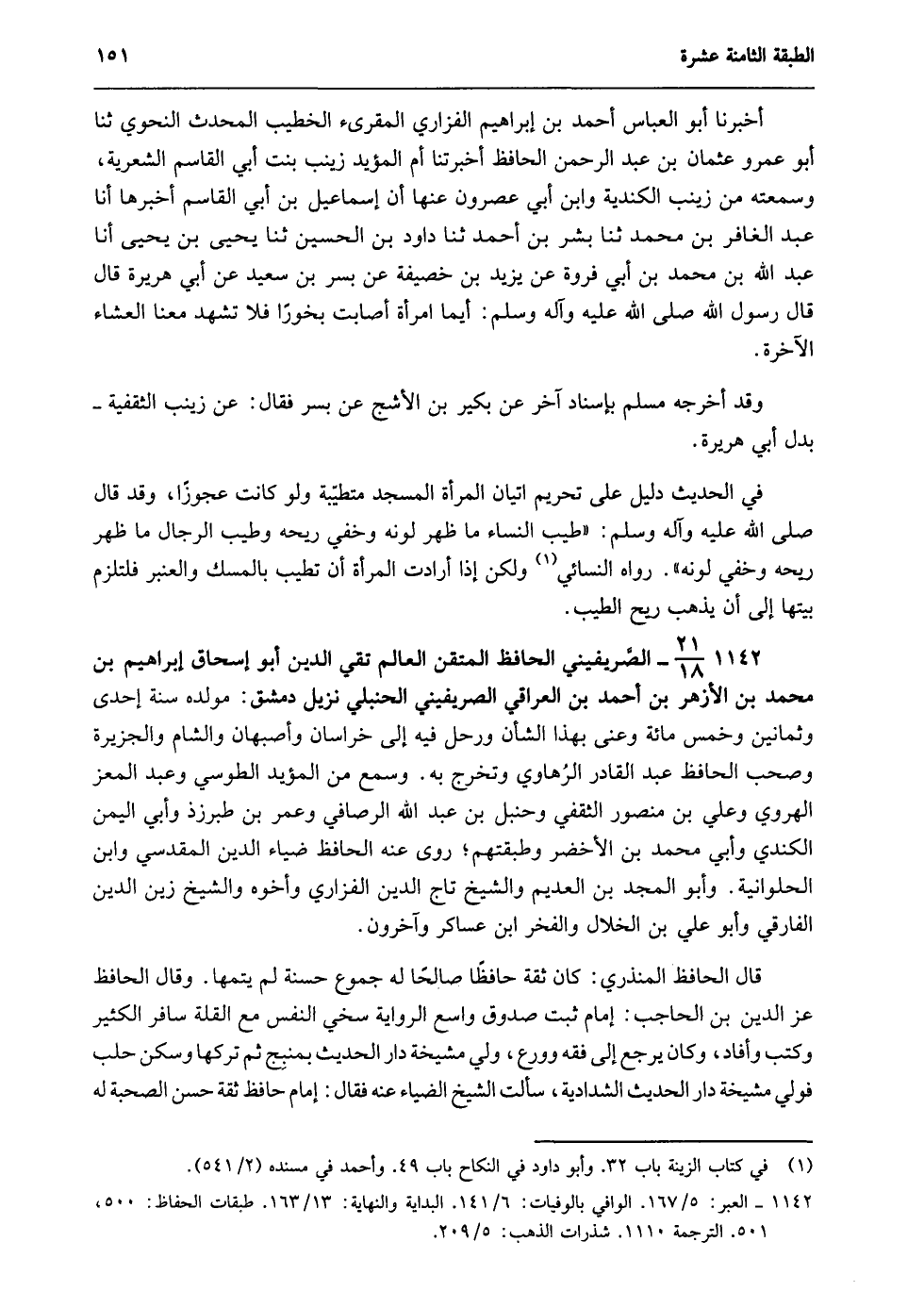 1142- 21/18- الصَّريفيني الحافظ المتقن العالم تقي الدين أبو إسحاق إبراهيم بن محمد بن الأزهر بن أحمد بن العراقي الصريفيني الحنبلي, نزيل دمشق: مولده سنة إحدى وثمانين وخمسمائة وعني بهذا الشأن ورحل فيه إلى خراسان وأصبهان والشام والجزيرة, وصحب الحافظ عبد القادر الرهاوي وتخرج به. وسمع من المؤيد الطوسي وعبد المعز الهروي وعلي بن منصور الثقفي وحنبل بن عبد الله الرصافي وعمر بن طبرزذ وأبي اليمن الكندي وأبي محمد بن الأخضر وطبقتهم؛ روى عنه الحافظ ضياء الدين المقدسي وابن الحلوانية, وأبو المجد بن العديم, والشيخ تاج الدين الفزاري وأخوه, والشيخ زين الدين الفارقي, وأبو علي بن الخلال, والفخر ابن عساكر, وآخرون.