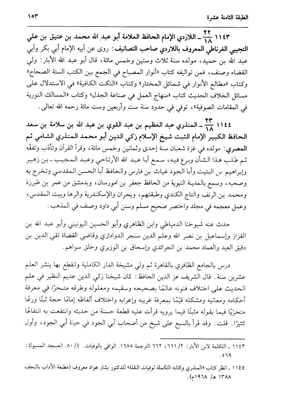 1144- انظر كتاب "المنذري وكتابه التكملة لوفيات النقلة" للدكتور بشار عواد معروف "مطبعة الآداب بالنجف 1388هـ/ 1968م".