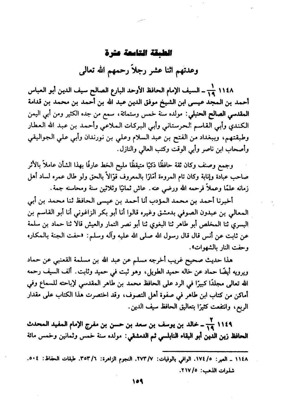 1148- 1/19- السيف الإمام الحافظ الأوحد البارع الصالح سيف الدين أبو العباس أحمد بن المجد عيسى ابن الشيخ موفق الدين عبد الله بن أحمد بن محمد بن قدامة المقدسي الصالح الحنبلي: مولده سنة خمس وستمائة، سمع من جده الكثير ومن أبى اليمن الكندي وأبي القاسم بن الحرستاني وأبي البركات الملاعي وأحمد بن عبد الله العطار وطبقتهم، وببغداد من الفتح بن عبد السلام وعلي بن نورندان وأبي علي الجواليقي وأصحاب ابن ناصر وأبي الوقت وكتب العالي والنازل.
